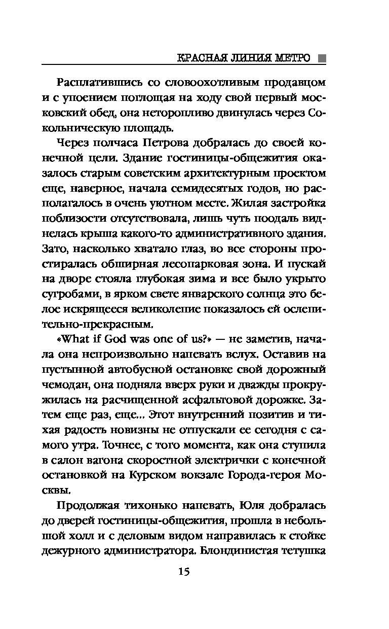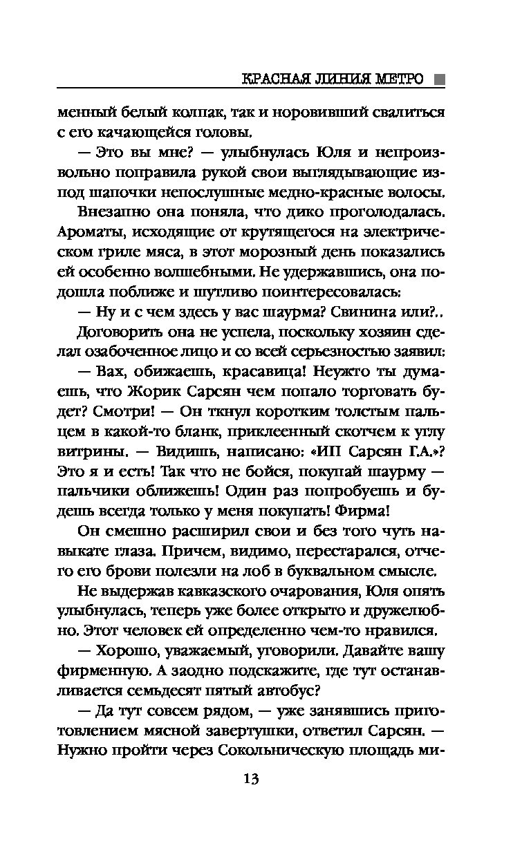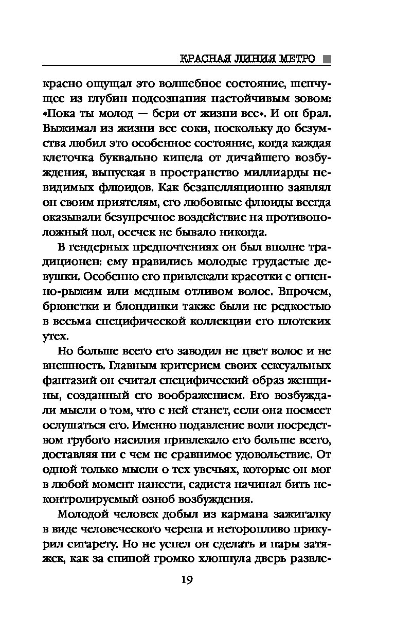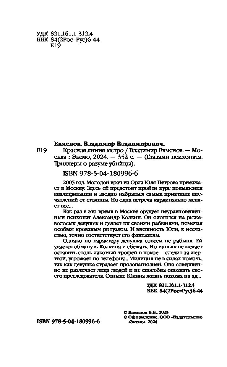 «Эта книга заставит вас погрузиться в самые темные глубины больной психики маньяка, узнать, как он мыслит и что чувствует. "Красная линия метро" — неожиданный по стилю психологический триллер, в котором читатель сможет и оказаться внутри убийцы, и увидеть его глазами жертвы». — Александра Маринина