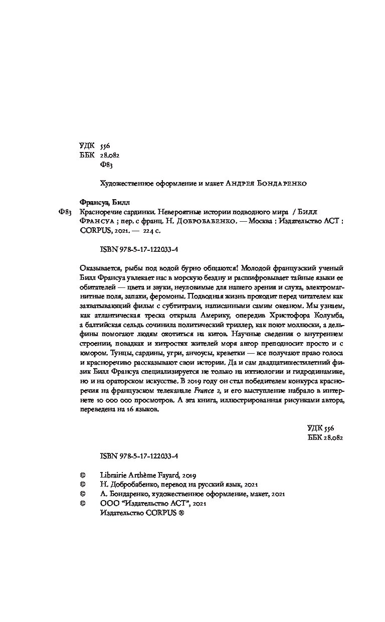 Рыбы, уверяет молодой французский ученый Билл Франсуа, разговорчивее, чем птицы в лесу. И у каждого вида – свой особый голос и свой уникальный язык. Например, солнечный окунь и ставрида скрипят зубами, сом стрекочет, заставляя вибрировать свои шипы, морской конёк водит по шее костистыми гребешками на задней поверхности головы, а бычок продувает воду через жабры. Кто-то использует для разговора изменение цвета собственного тела, кто-то – особые запахи, одни способны считывать электрические поля, другие – мельчайшие течения и завихрения в толще воды. Научившись понимать все эти подводные «языки», можно узнать совершенно невероятные истории, которые бережно хранятся в безбрежных водах. Например, о самом одиноком в мире ките, который издает звуки на частоте 52 Гц, в то время, как его сородичи общаются на частотах от 10 до 35 Гц, а значит, у него нет даже гипотетического шанса быть услышанным. Или о том, как морские гребешки при помощи своеобразной «симфонии чихания» сообщают океанографам о состоянии моря.