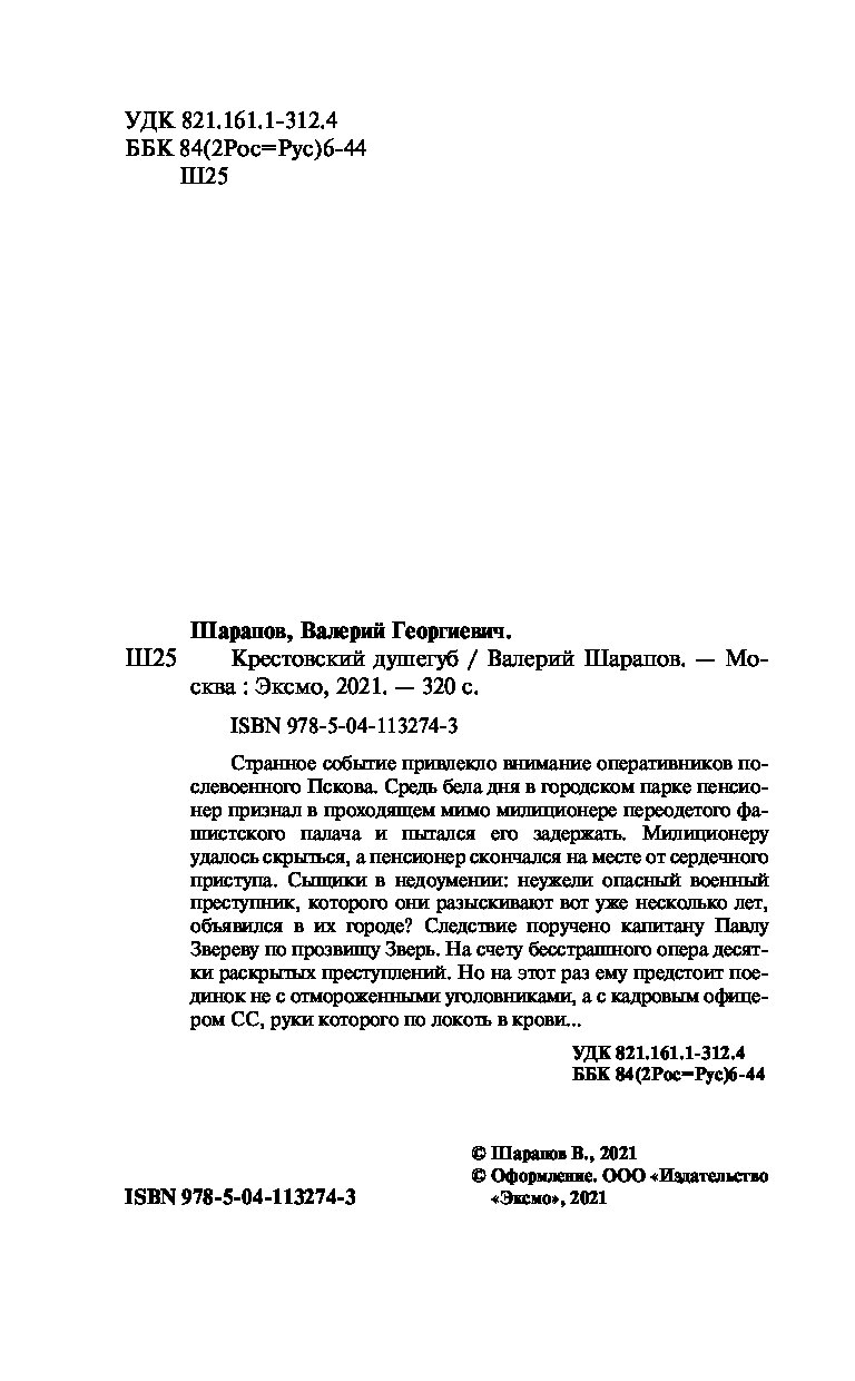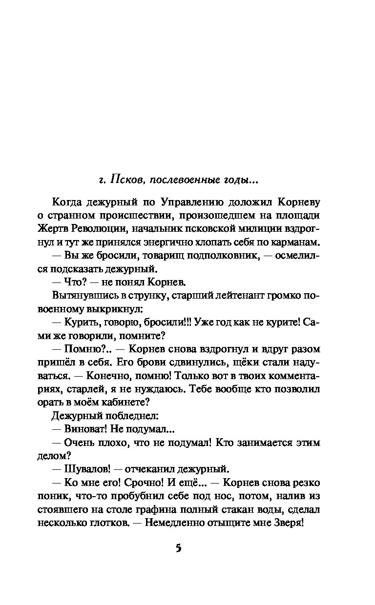 Странное событие привлекло внимание оперативников послевоенного Пскова. Среди белого дня в городском парке пенсионер признал в проходящем мимо милиционере переодетого фашистского палача и пытался его задержать. Милиционеру удалось скрыться, а пенсионер скончался на месте от сердечного приступа. Сыщики в недоумении: неужели опасный военный преступник, которого они разыскивают вот уже несколько лет, объявился в их городе? Следствие поручено капитану Павлу Звереву по прозвищу «Зверь». На счету бесстрашного опера десятки раскрытых преступлений. Но на этот раз ему предстоит поединок не с отмороженными уголовниками, а с кадровым офицером СС, руки которого по локоть в крови…