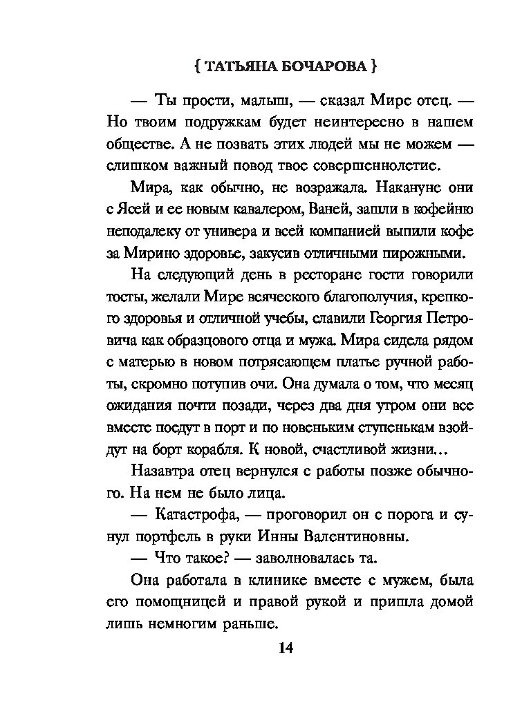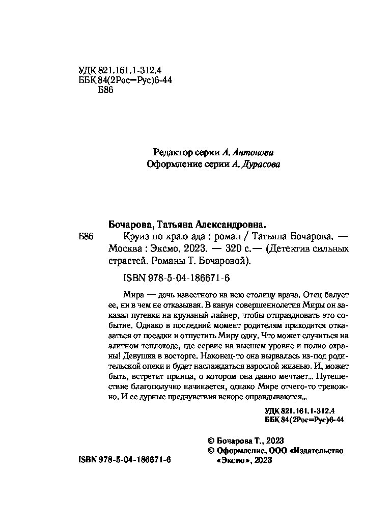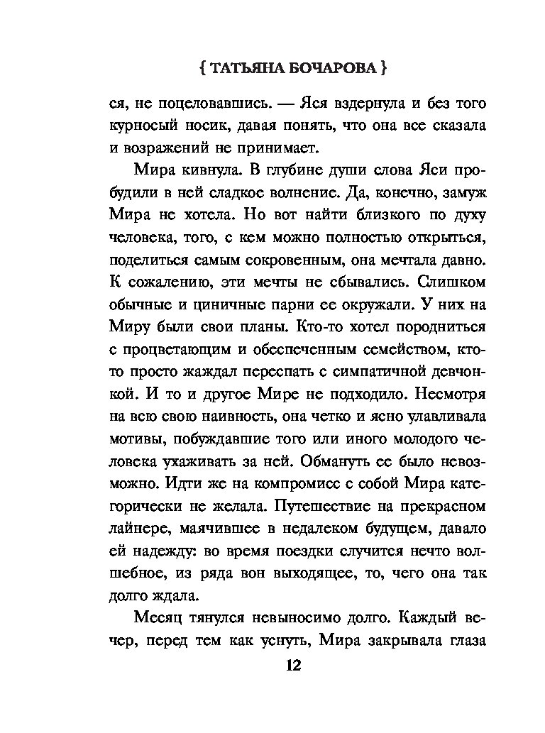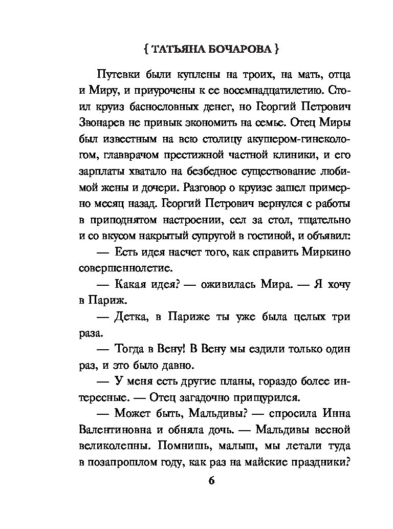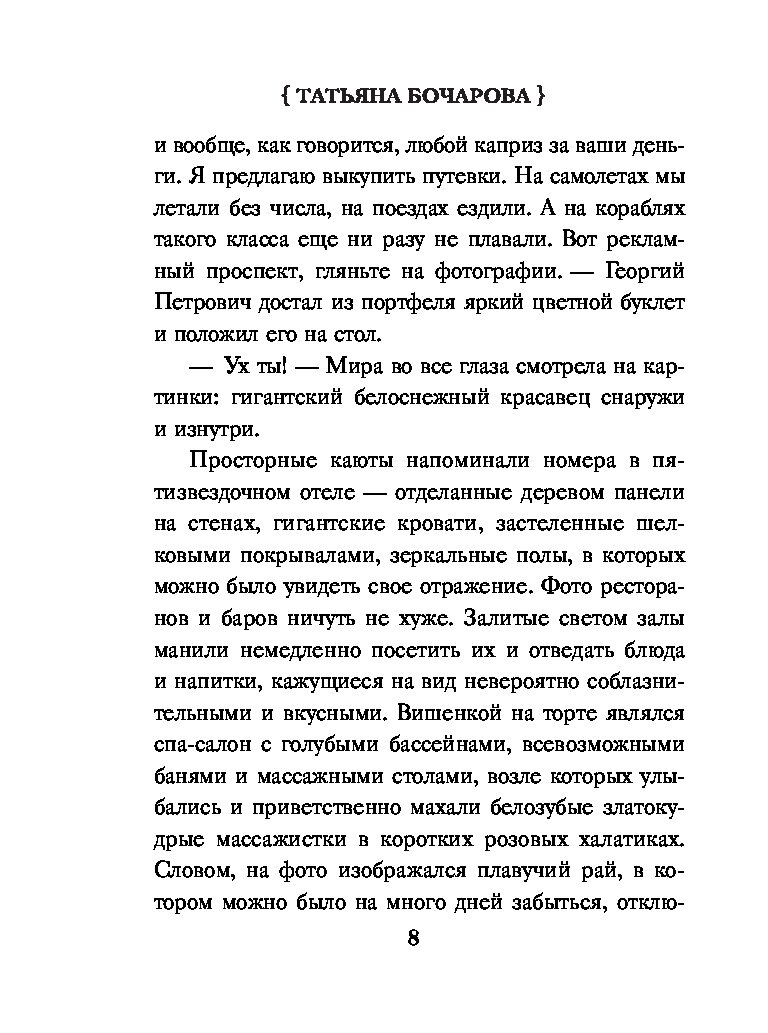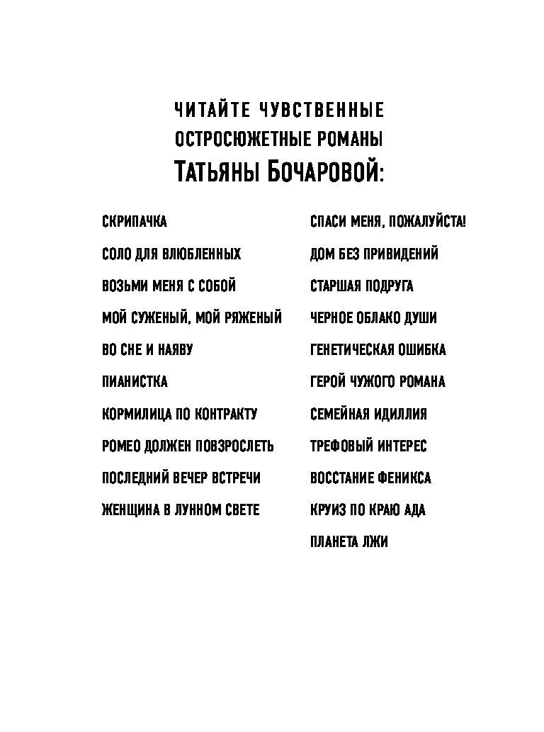 Остросюжетные мелодрамы Татьяны Бочаровой из серии «Детектив сильных страстей» — увлекательные повести для широкой читательской аудитории, где действительность узнаваема, в героях можно увидеть себя и своих близких, прописаны традиционные ценности, добро в финале побеждает зло и справедливость торжествует.