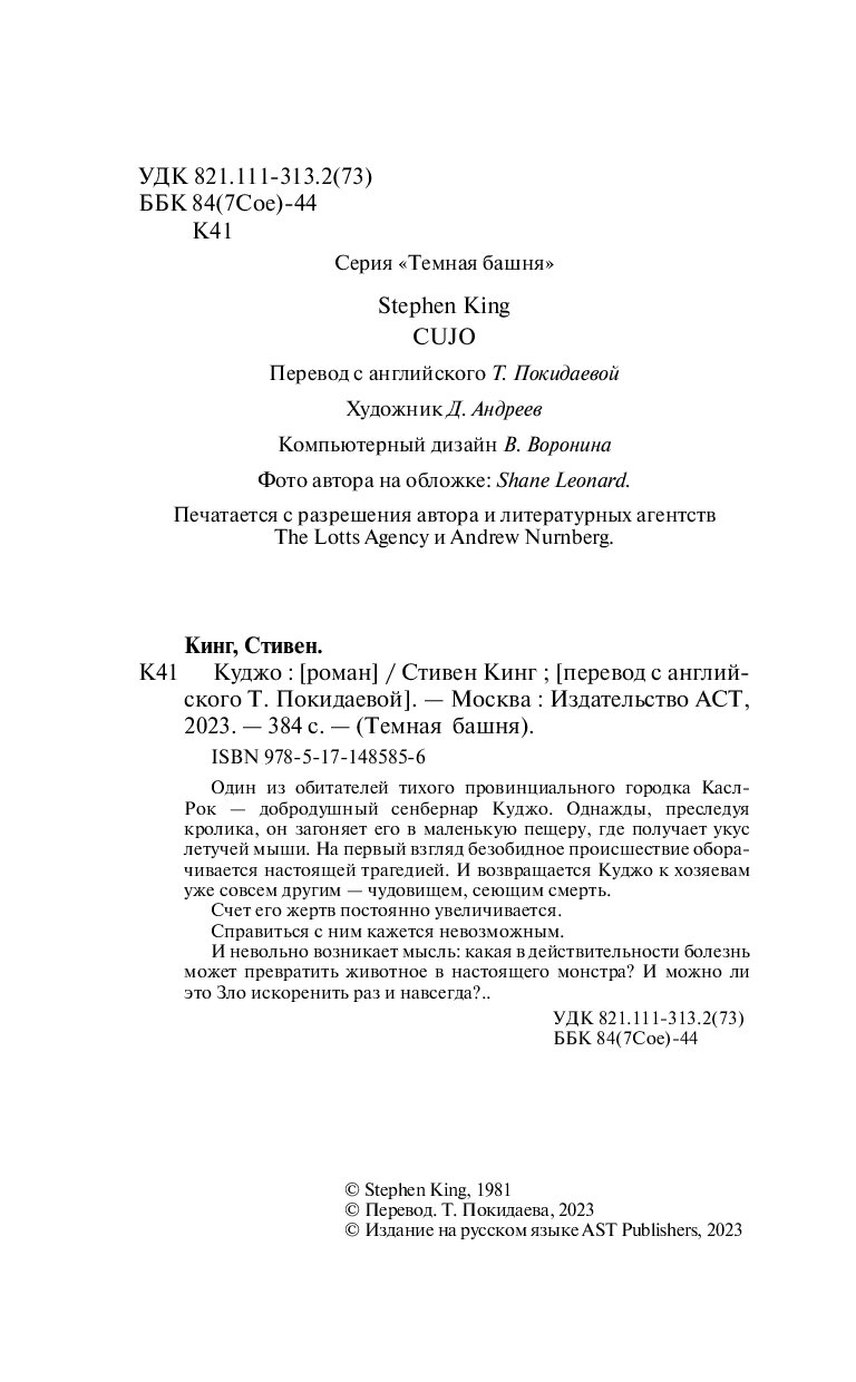 Купить книгу Куджо в интернет-магазине Book24.kz можно по лучшей цене. Напрямую сотрудничая с издательствами, мы сохраняем доступную стоимость всех книг и предлагаем покупателям выгодные условия продажи. Гарантируем адресную доставку заказов по Казахстану в течение 1-9 дней, отправляем книги Казпочтой и EMC Актау, Актобе, Атырау, Караганду, Кокшетау, Костанай, Кызылорду, Павлодар, Петропавловск, Талдыкорган, Тараз, Уральск, Усть-Каменогорск, Шымкент, Алматы, Астану и другие города. Заказать книгу у нас не составит труда, стоит только выбрать из каталога интересующее издание с фото и кратким описанием и сделать оформление заказа по телефону или онлайн. Мы позаботимся, чтобы вы получили книгу как можно скорее.