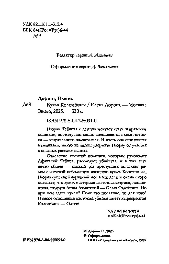 Отделение сыскной полиции, которым руководит Афанасий Чебнев, расследует убийства, в которых есть нечто общее: каждый раз преступник оставляет рядом с жертвой небольшую изящную куклу. Конечно же, Нюрка сует свой курносый нос в расследование и очень скоро выясняет, что кукол мастерила известная актриса, танцовщица, подруга Анны Ахматовой — Ольга Судейкина. Но при чем здесь куклы? Если это послание, то для кого? И какое отношение жестокий убийца имеет к прекрасной Коломбине — Ольге Судейкиной?