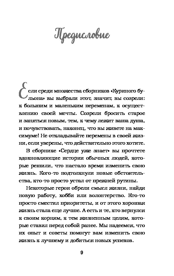 В детстве, когда вы болели, ваша бабушка давала вам куриный бульон. Сегодня питание и забота нужны вашей душе. Маленькие истории из «Куриного бульона» исцелят душевные раны и укрепят дух, дадут вашим мечтам новые крылья и откроют секрет самого большого счастья — счастья делиться и любить.