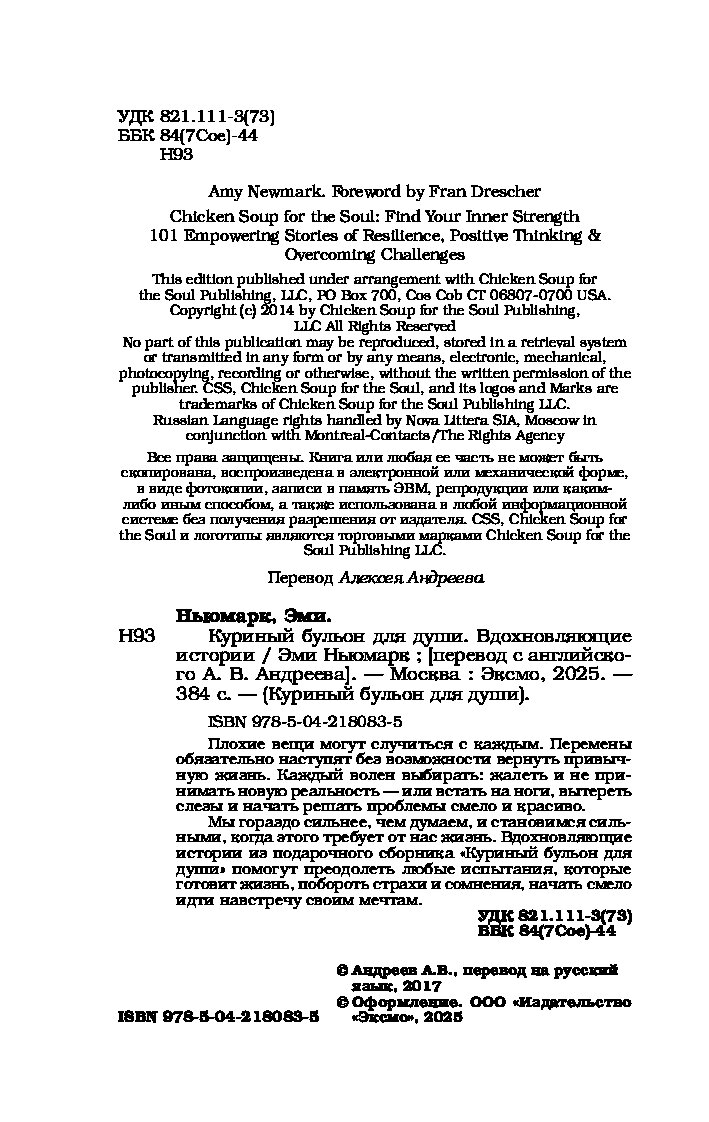 В детстве, когда вы болели, ваша бабушка давала вам куриный бульон. Сегодня питание и забота нужны вашей душе. Маленькие истории из «Куриного бульона» исцелят душевные раны и укрепят дух, дадут вашим мечтам новые крылья и откроют секрет самого большого счастья — счастья делиться и любить.