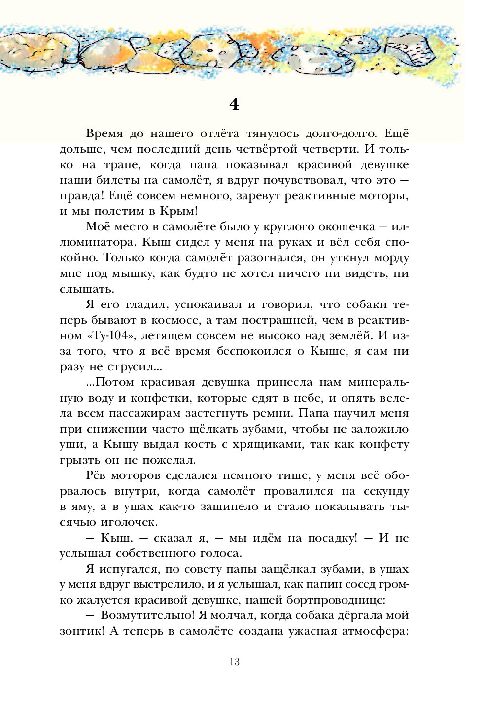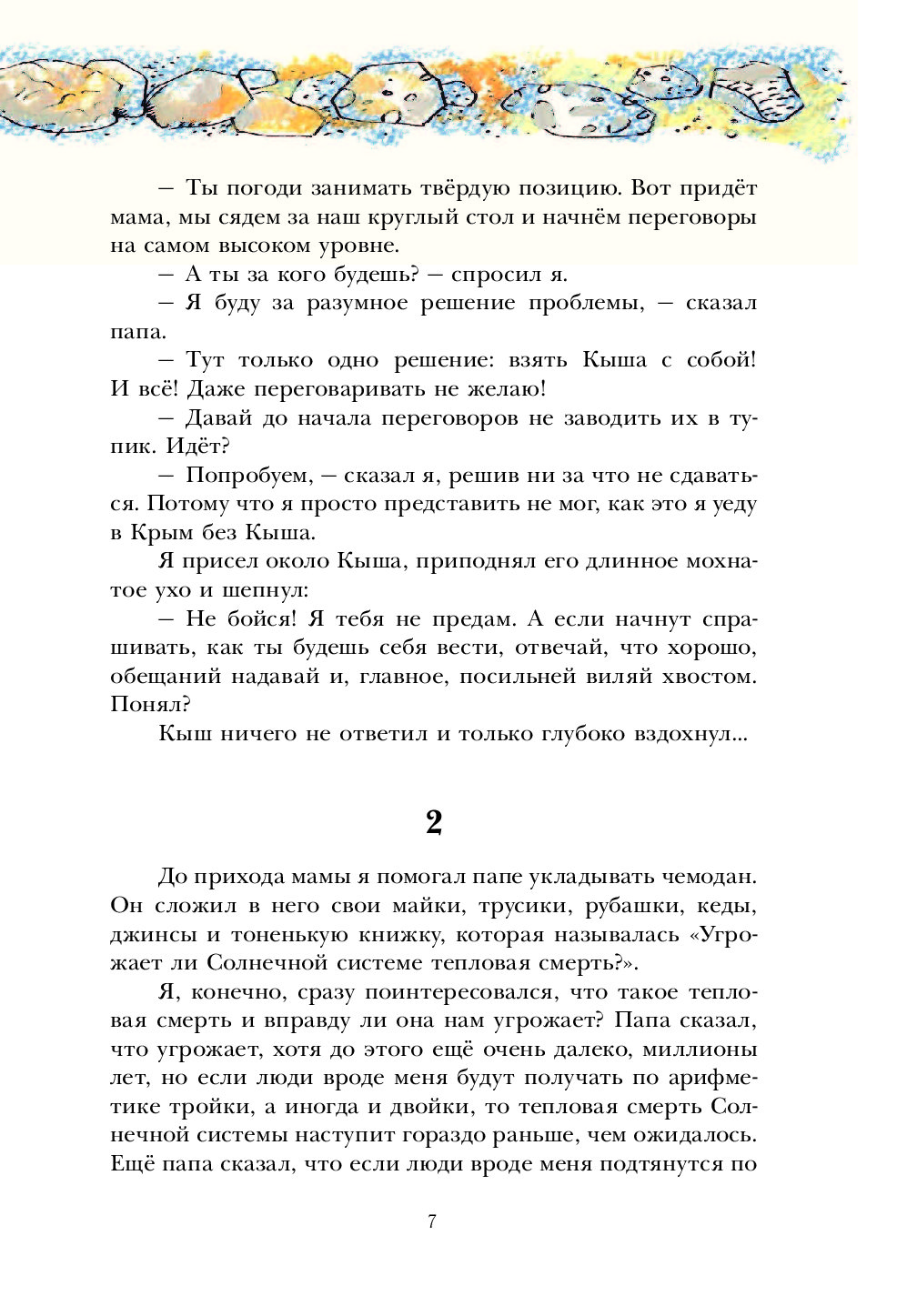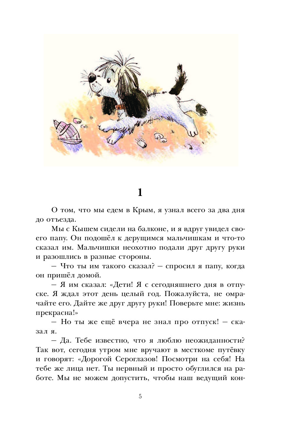 «Кыш и я в Крыму» - это вторая часть истории «Кыш, Двапортфеля и целая неделя» Юза Алешковского. Повесть о хорошем, правильном детстве с понимающими родителями, другом-собакой и другом-девчонкой. Приключения, о которых только могут мечтать современные мальчишки: трудная борьба с вандалами и хулиганами, встреча с настоящими крымскими партизанами, новые друзья из «Пионерского патруля». А ещё море, чудесная крымская природа и очень добрый и мужественный главный герой – восьмилетний Алёша Сероглазов.