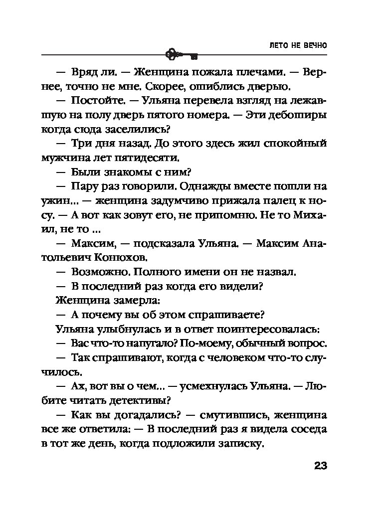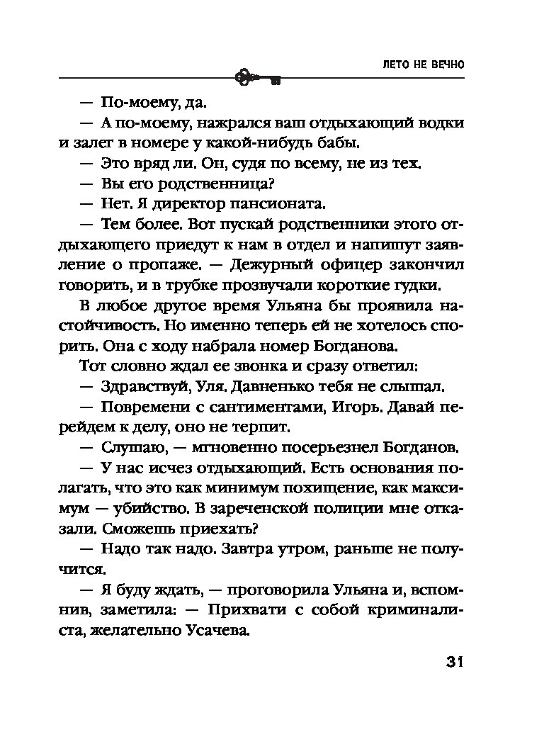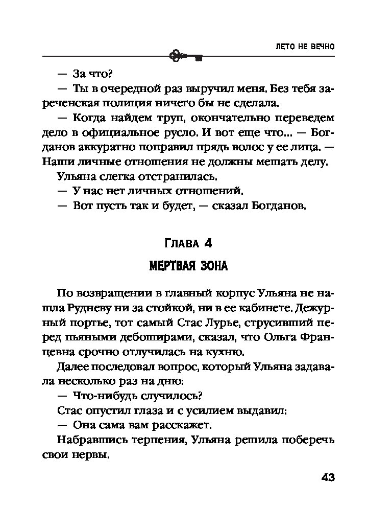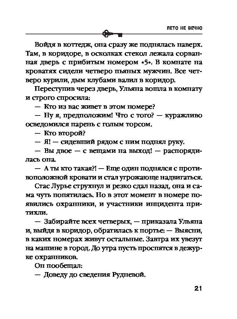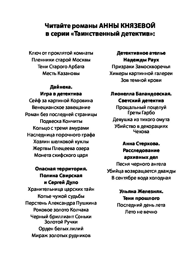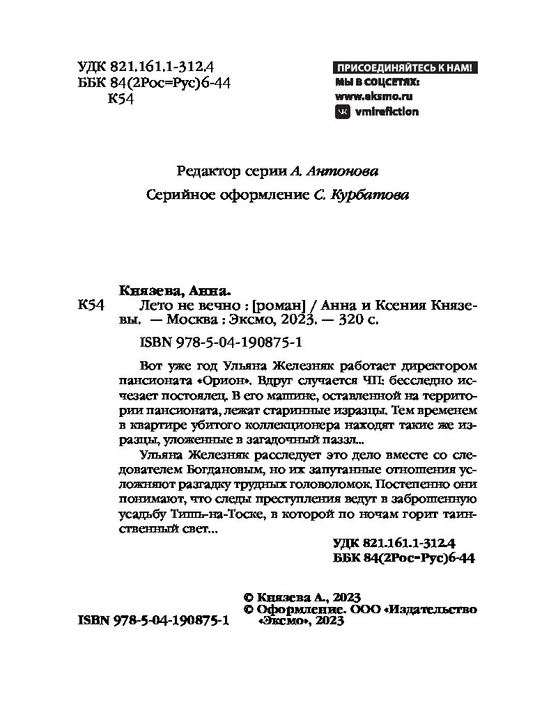 Издательство «Эксмо» представляет детективный роман Анны и Ксении Князевых «Лето не вечно» из нового сериала «Ульяна Железняк. Тени прошлого». Отличительная особенность цикла — расследование старых преступлений. Они странным образом связаны с теми, что происходят в загородном пансионате, где работает главная героиня романа Ульяна Железняк.