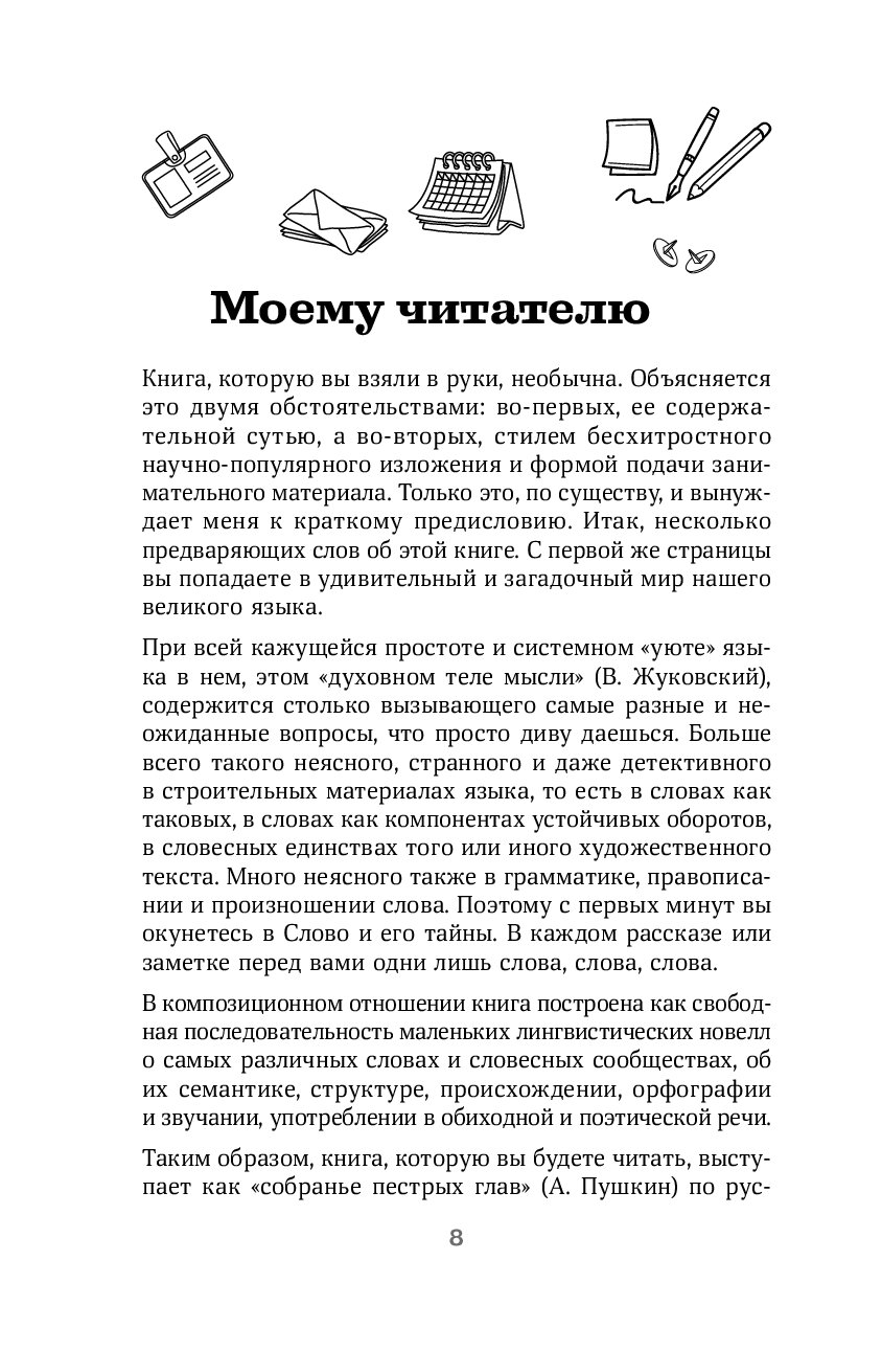 В этой книге вас ждут «Тайны слов». Вместе с выдающимся отечественным лингвистом вы пройдете тайными тропинками истории появления и использования слов и выражений, познакомитесь с выразительными средствами русского литературного языка, их изменениями и трансформацией в художественной речи.