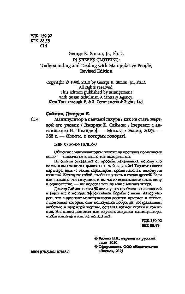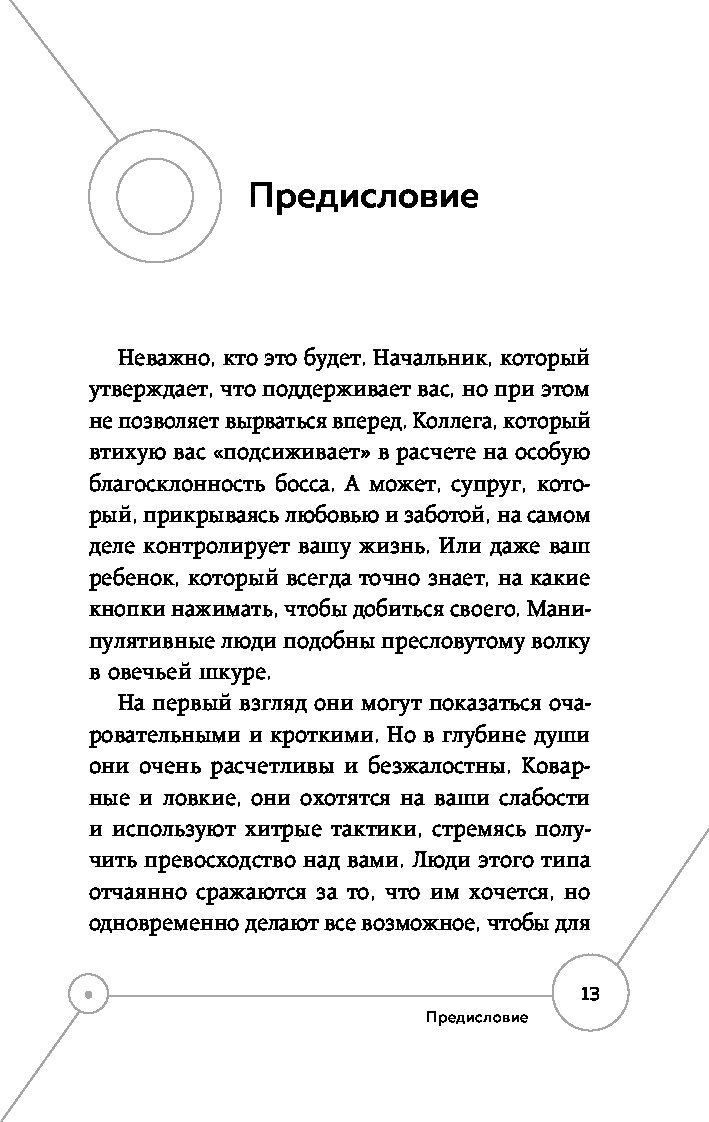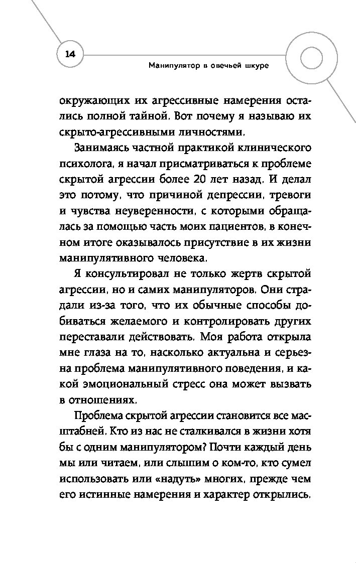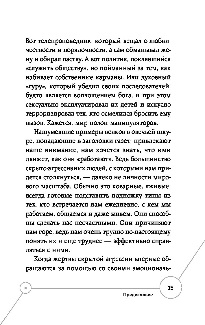 Проблема скрытой агрессии становится все масштабней. Кто из нас не сталкивался в жизни хотя бы с одним манипулятором? Почти каждый день мы или читаем, или слышим о ком-то, кто сумел использовать или «надуть» многих, прежде чем его истинные намерения и характер открылись.Умение распознать волка в овечьей шкуре и понимание, что ожидать от такого человека — первый шаг к тому, чтобы не стать его жертвой. Из этой книги вы узнаете о характеристиках агрессивных типов личности и эффективные инструменты для борьбы с ними.