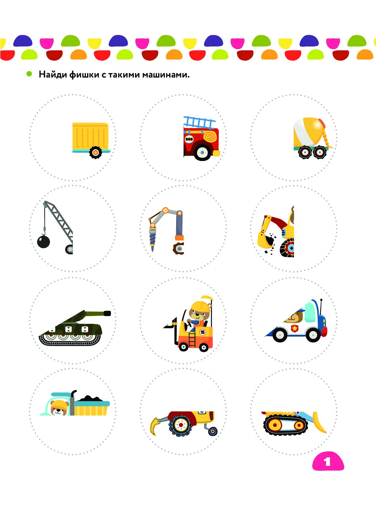 На страничках расположены интересные задания. Чтобы их выполнить, малышу нужно подобрать подходящие фишки с картинками.