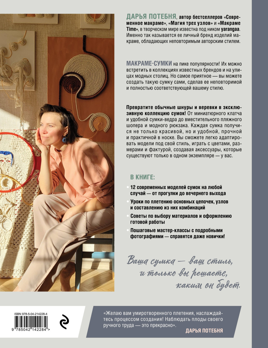 Дарья Потебня, автор бестселлеров по макраме и блогер, известная в творческом мире под ником yarangaa, научит вас плести стильные сумки в два счета! В своей новой книге она собрала 12 моделей на все случаи жизни: легкий клатч для вечернего выхода, удобную сумку-ведро для прогулок, вместительный шоппер для пляжа и даже рюкзак для повседневных дел.