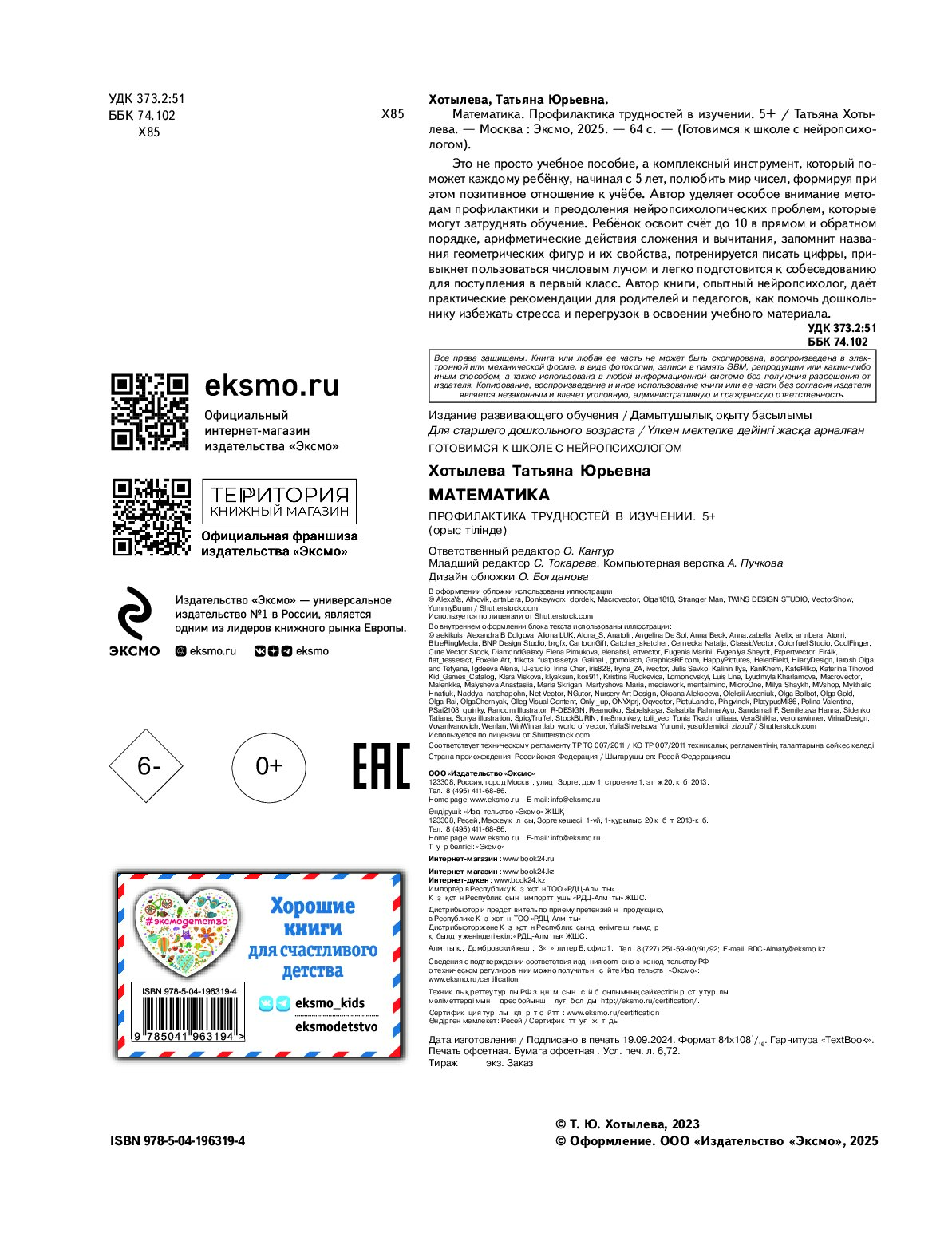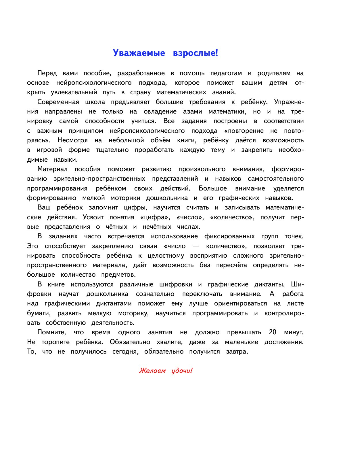 Это уникальное издание разработано опытным нейропсихологом, чтобы облегчить процесс изучения азов математики дошкольниками начиная с 5 лет. Автор уделяет особое внимание методам профилактики и преодоления нейропсихологических проблем, которые могут затруднять обучение. Ребёнок освоит счёт до 10 в прямом и обратном порядке, арифметические действия сложения и вычитания, запомнит названия геометрических фигур и их свойства, потренируется писать цифры, привыкнет пользоваться числовым лучом и легко подготовится к собеседованию для поступления в первый класс. Ряд заданий направлен на развитие когнитивных навыков, таких как память, внимание, пространственное мышление и мелкая моторика. В книге предоставляются практические рекомендации для родителей и педагогов, как помочь дошкольнику избежать стресса и перегрузок в освоении учебного материала. Это не просто учебное пособие, а комплексный инструмент, который поможет каждому ребёнку полюбить мир цифр, формируя при этом позитивное отношение к учёбе.