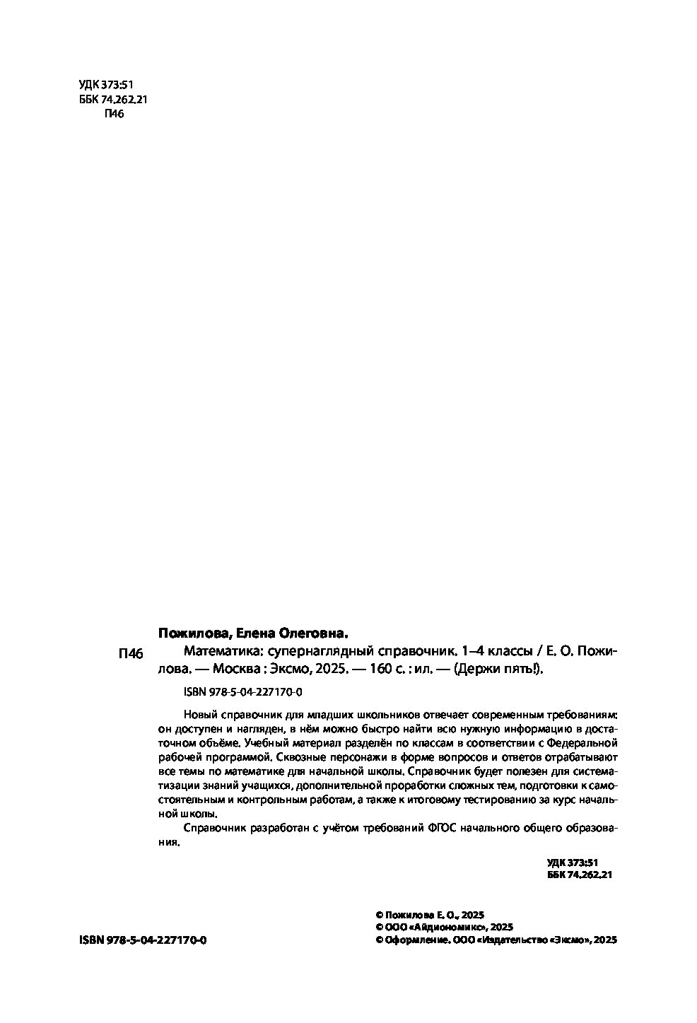 Справочник разработан в полном соответствии с требованиями ФГОС начального общего образования. Это прекрасный подарок детям на 1 сентября, который поможет им успешно справляться с домашними заданиями и освоить программу математики. Книга полезна не только ученикам начальной школы, но и их родителям, желающим помочь с выполнением домашних заданий, а также педагогам, стремящимся сделать уроки математики более наглядными и интересными. Этот универсальный справочник — отличный помощник для подготовки к ВПР, контрольным и самостоятельным работам!