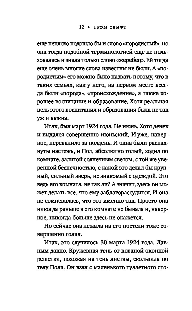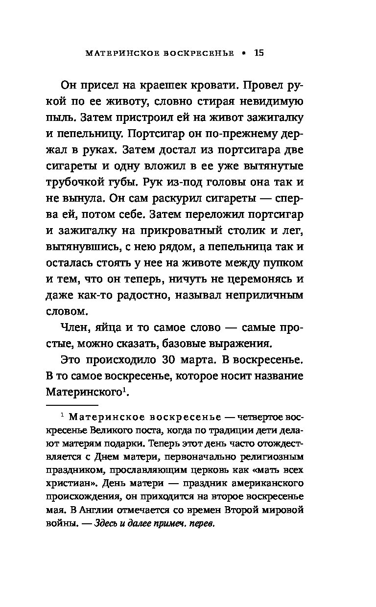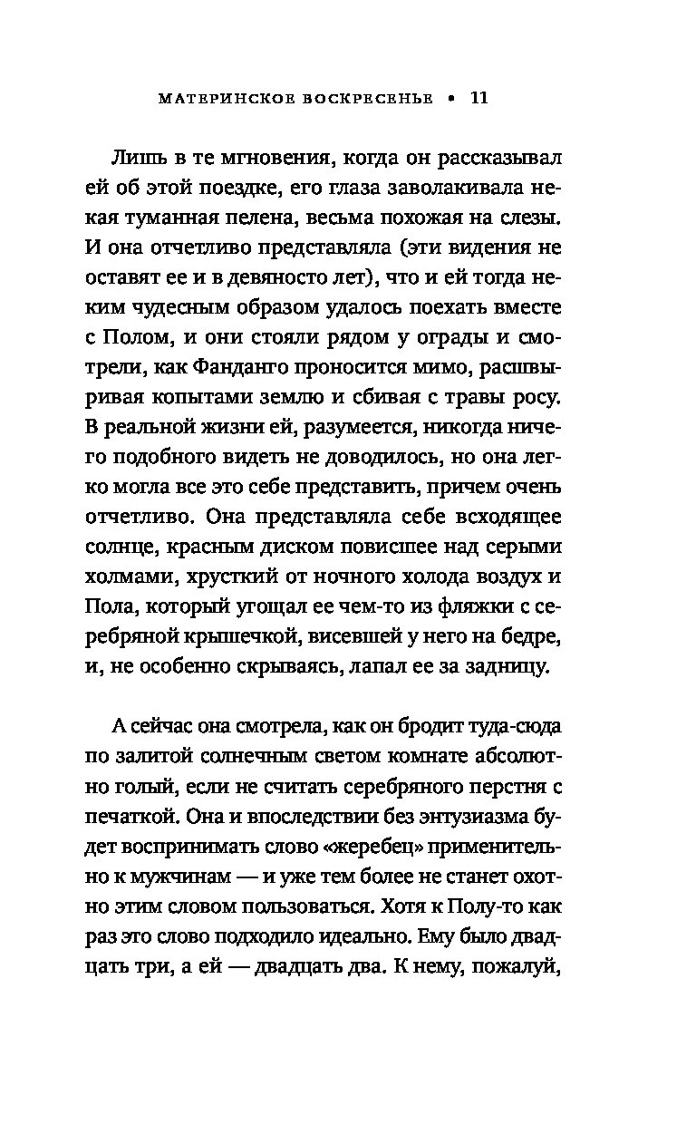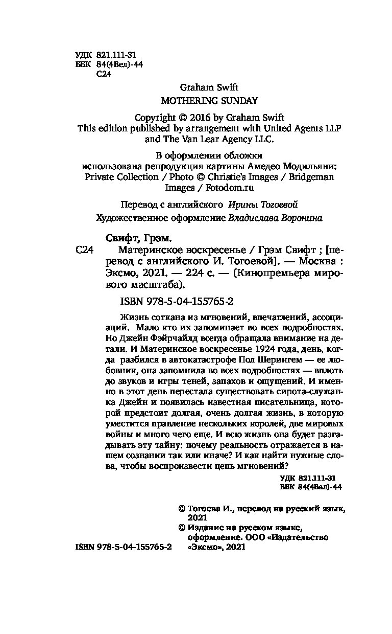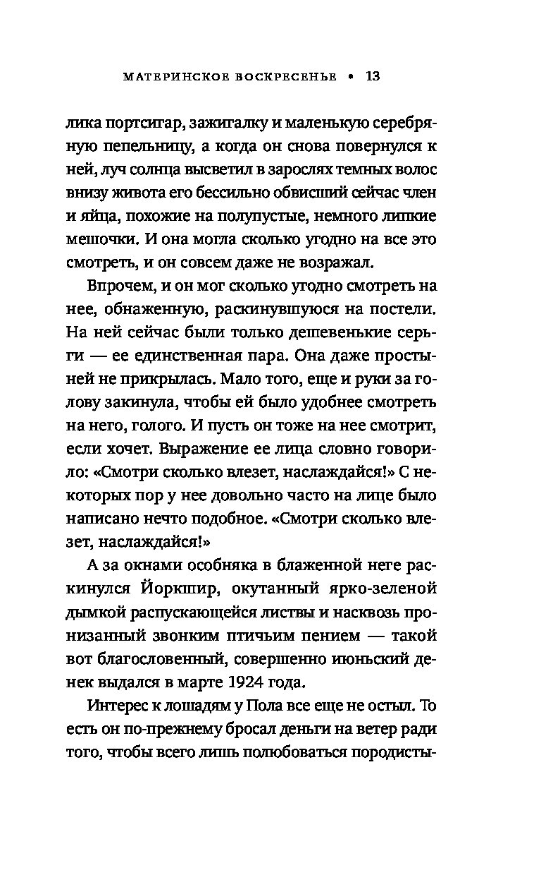 Жизнь соткана из мгновений, впечатлений, ассоциаций. Мало кто их запоминает во всех подробностях. Но Джейн Фэйрчайлд всегда обращала внимание на детали. И Материнское воскресенье 1924 года, день, когда разбился в автокатастрофе Пол Шерингем — ее любовник, она запомнила во всех подробностях — вплоть до звуков и игры теней, запахов и ощущений. И именно в этот день перестала существовать сирота-служанка Джейн и появилась известная писательница, которой предстоит долгая, очень долгая жизнь, в которую уместится правление нескольких королей, две мировые войны и много что еще. И всю жизнь она будет разгадывать эту тайну — почему реальность отражается в нашем сознании так или иначе? И как найти нужные слова, чтобы воспроизвести цепь мгновений?