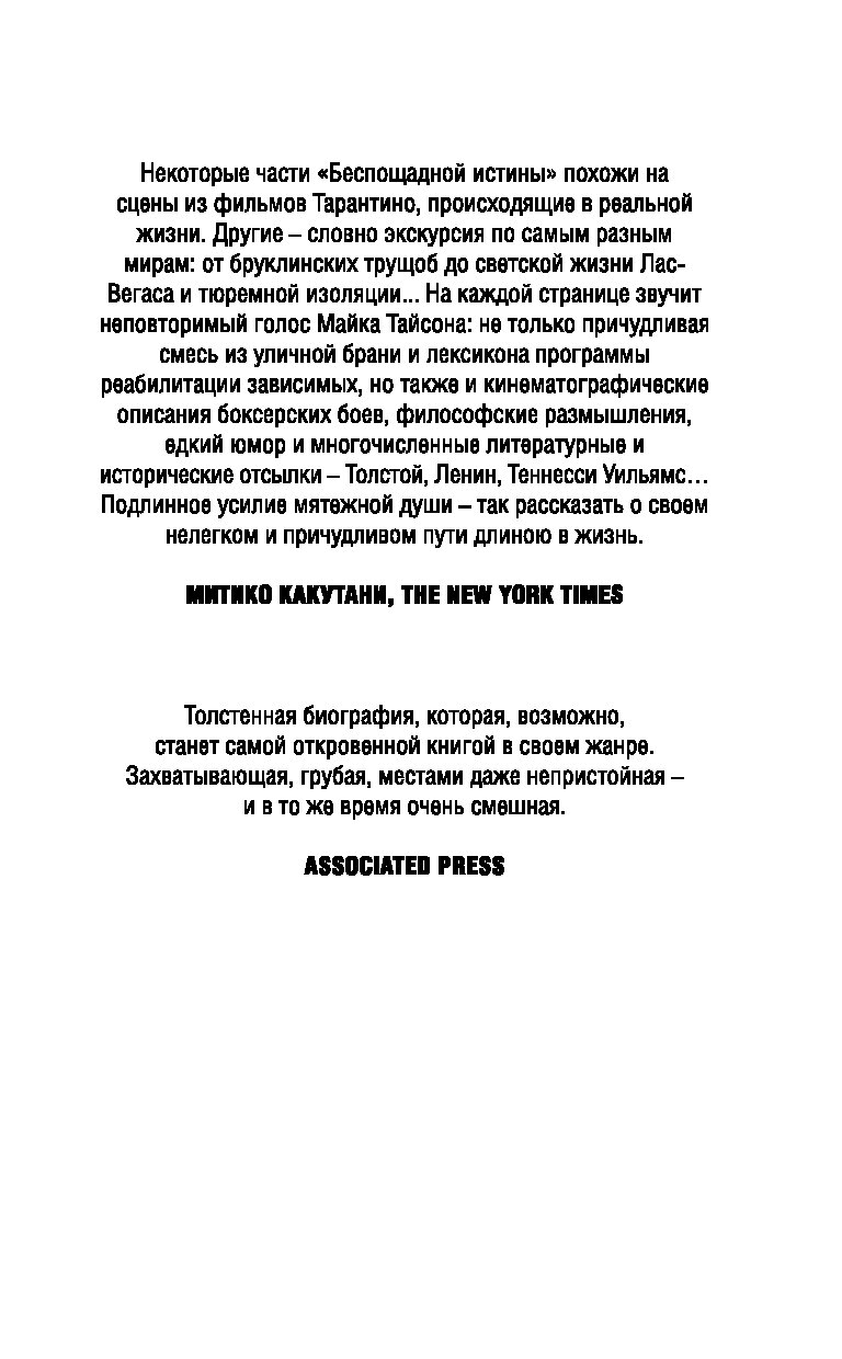 «Некоторые части "Беспощадной истины" похожи на сцены из фильмов Тарантино, происходящие в реальной жизни. Другие — словно экскурсия по самым разным мирам: от бруклинских трущоб до светской жизни Лас-Вегаса и тюремной изоляции... На каждой странице звучит неповторимый голос Майка Тайсона: не только причудливая смесь из уличной брани и лексикона программы реабилитации зависимых, но также и кинематографические описания боксерских боев, философские размышления, едкий юмор и многочисленные литературные и исторические отсылки — Толстой, Ленин, Теннесси Уильямс… Подлинное усилие мятежной души — так рассказать о своем нелегком и причудливом пути длиною в жизнь». — Митико Какутани, The New York Times