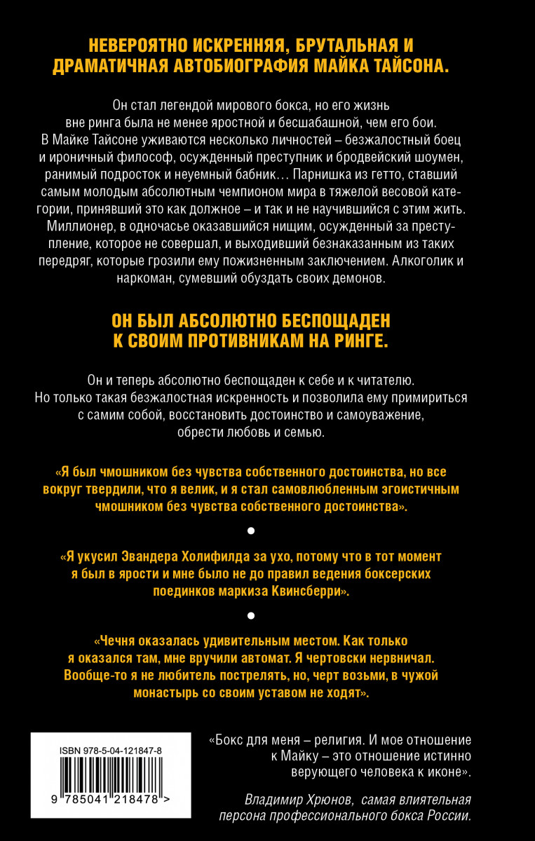 В Майке Тайсоне уживаются несколько личностей — безжалостный боец и ироничный философ, осужденный преступник и бродвейский шоумен, ранимый подросток и неуемный бабник… Парнишка из гетто, ставший самым молодым абсолютным чемпионом мира в тяжелой весовой категории, принявший это как должное — и так и не научившийся с этим жить. Миллионер, в одночасье оказавшийся нищим, осужденный за преступление, которое не совершал, и выходивший безнаказанным из таких передряг, которые грозили ему пожизненным заключением. Алкоголик и наркоман, сумевший обуздать своих демонов.