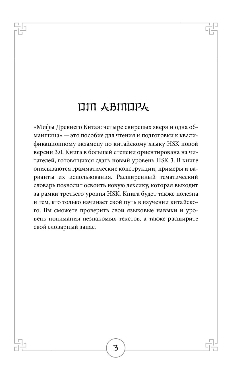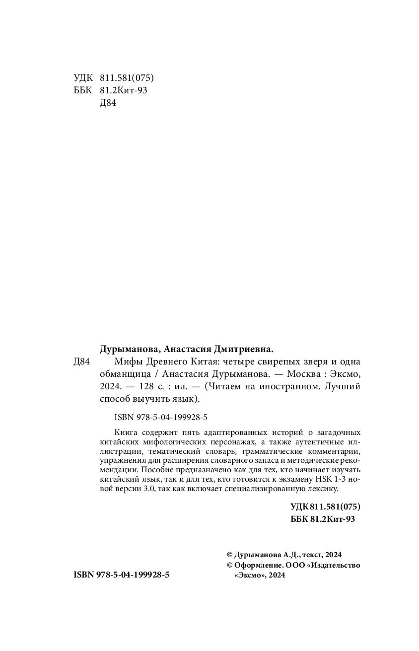 Читать на китайском языке могут только профессионалы? Конечно, нет. В этой книге вас ждут адаптированные рассказы о загадочном Хаосе Хуньдуне или Дицзяне, который породил мир, ужасном крылатом полутигре-полубыке Цюнци, вероломном и смелом покровителе воинов Таоу, свирепом Таоте, пятом сыне Дракона и хитрой обманщице лисице-оборотне Хули-цзин. Автор-составитель А. Д. Дурыманова, преподаватель РГГУ и НИУ ВШЭ, подготовила методические рекомендации, которые помогут сделать процесс чтения эффективным и доступным. Также каждая история сопровождается словарём с транскрипцией пиньинь, упражнениями, грамматическими комментариями и аутентичными иллюстрациями. А благодаря специализированной лексике вы сможете подготовиться к экзамену HSK 1-3 новой версии 3.0.