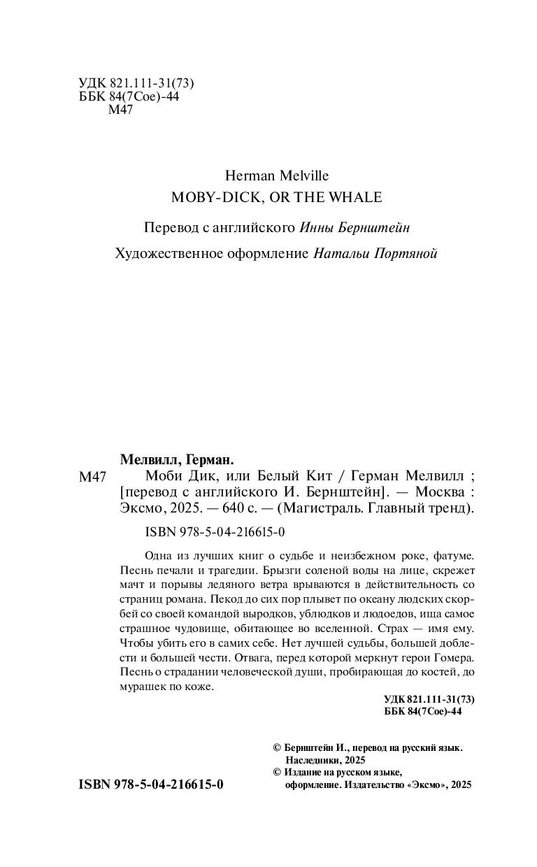«Моби Дик, или Белый Кит» — один из самых великих американских романов и аллегория борьбы человека с мировым злом. Автор называл книгу романтическим приключением, основанном на его двухлетнем опыте гарпунера и на одной из тех диких легенд, что ходят между китобоями южных морей. В основе сюжета лежит реальная история. Эрнест Хемингуэй и Уильям Фолкнер провозгласили роман литературной иконой, а в США до сих пор царит настоящий культ Мелвилла.