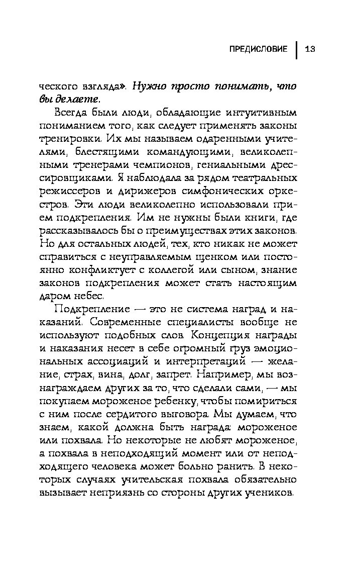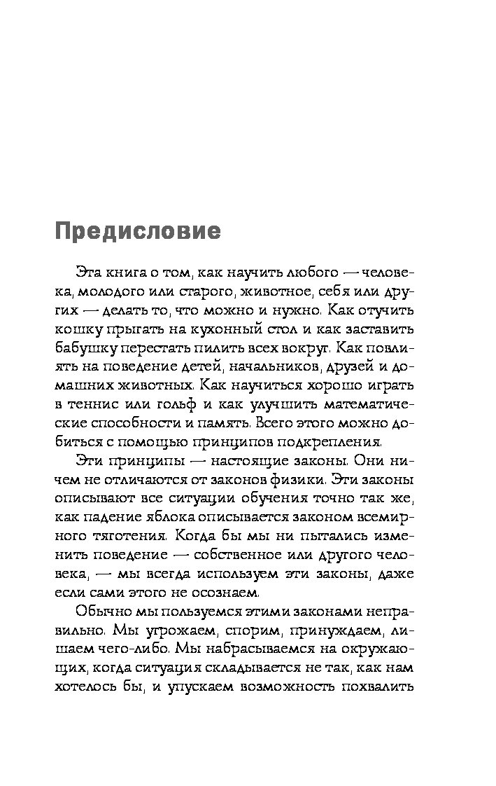 Карен Прайор предлагает гениально простую и эффективную методику, которая поможет вам научить кого угодно поступать так, как вам хочется. Речь не идет о коварных манипуляциях, гипнозе и полном подчинении воли. Речь идет о положительном подкреплении - самом надежном и действенном способе влиять на поведение других. Вы узнаете, как заставить супруга раз и навсегда перестать ворчать; как научить трехлетнего ребенка вести себя прилично; как объяснить кошке, что не надо залезать на кухонный стол; как сподвигнуть начальника регулярно повышать вам зарплату; как улучшить свои собственные результаты в любой деятельности - от занятий спортом до сочинения стихов, или как избавиться от вредных привычек с помощью положительного подкрепления.