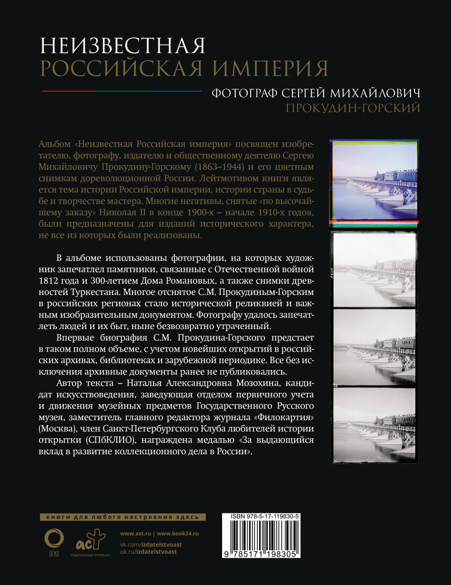 Купить книгу Неизвестная Российская империя. Фотограф Сергей Михайлович Прокудин-Горский в интернет-магазине Book24.kz можно по лучшей цене. Напрямую сотрудничая с издательствами, мы сохраняем доступную стоимость всех книг и предлагаем покупателям выгодные условия продажи. Гарантируем адресную доставку заказов по Казахстану в течение 1-9 дней, отправляем книги Казпочтой и EMC Актау, Актобе, Атырау, Караганду, Кокшетау, Костанай, Кызылорду, Павлодар, Петропавловск, Талдыкорган, Тараз, Уральск, Усть-Каменогорск, Шымкент, Алматы, Астану и другие города. Заказать книгу у нас не составит труда, стоит только выбрать из каталога интересующее издание с фото и кратким описанием и сделать оформление заказа по телефону или онлайн. Мы позаботимся, чтобы вы получили книгу как можно скорее.