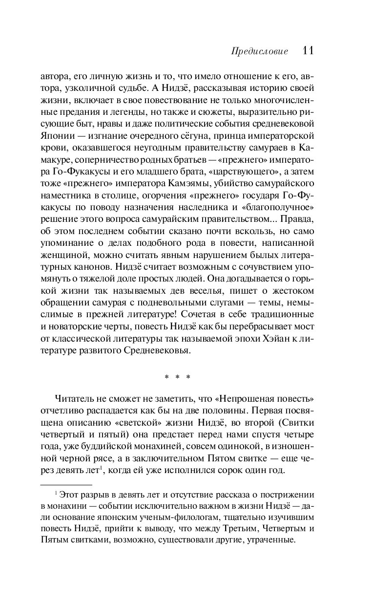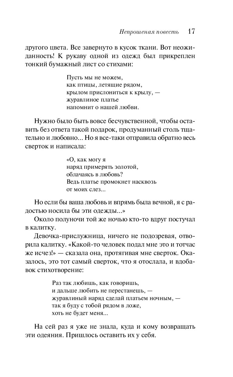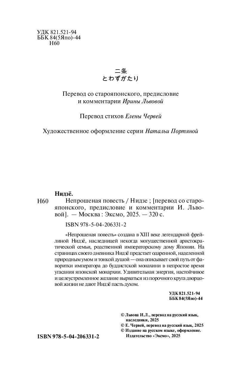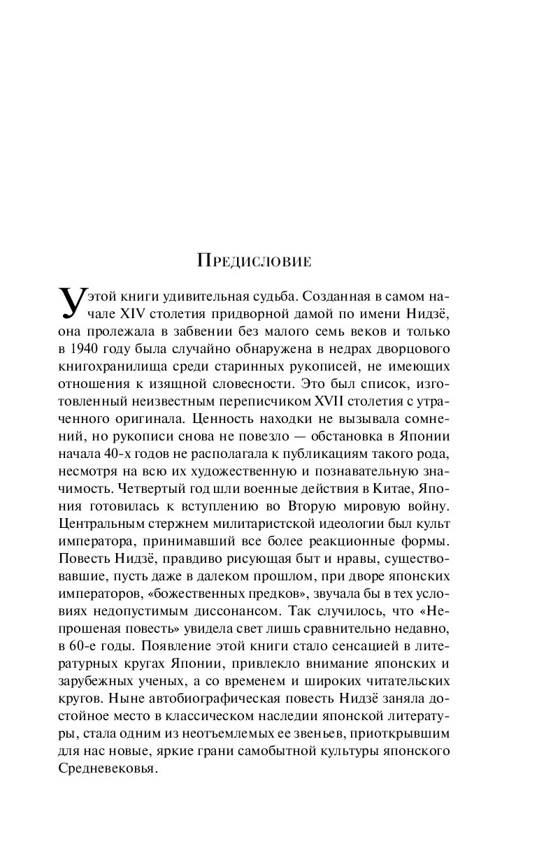 «Непрошеная повесть» создана в XIII веке легендарной фрейлиной Нидзё, наследницей некогда могущественной аристократической семьи, родственной императорскому дому Японии. На страницах своего дневника Нидзё предстает одаренной, наделенной природным умом и тонкой душой — она описывает свой путь от фаворитки императора до буддийской монахини в непростое время угасания японской монархии. Удивительная энергия, настойчивое и целеустремленное желание вырваться из порочного круга дворцовой жизни не дают Нидзё пасть духом.