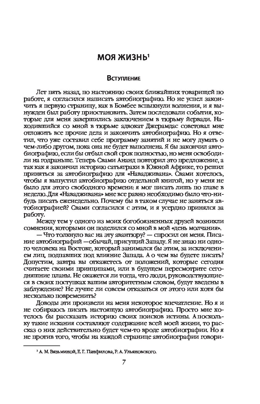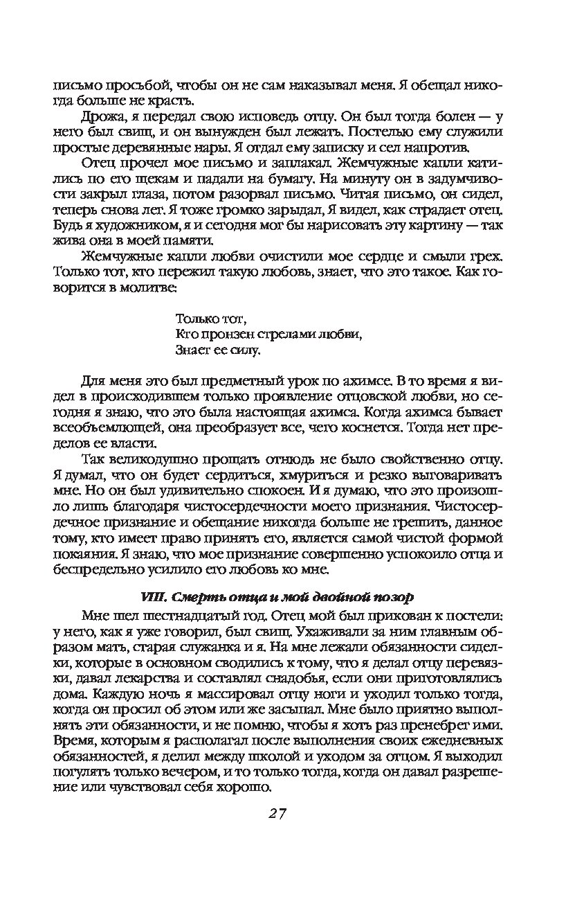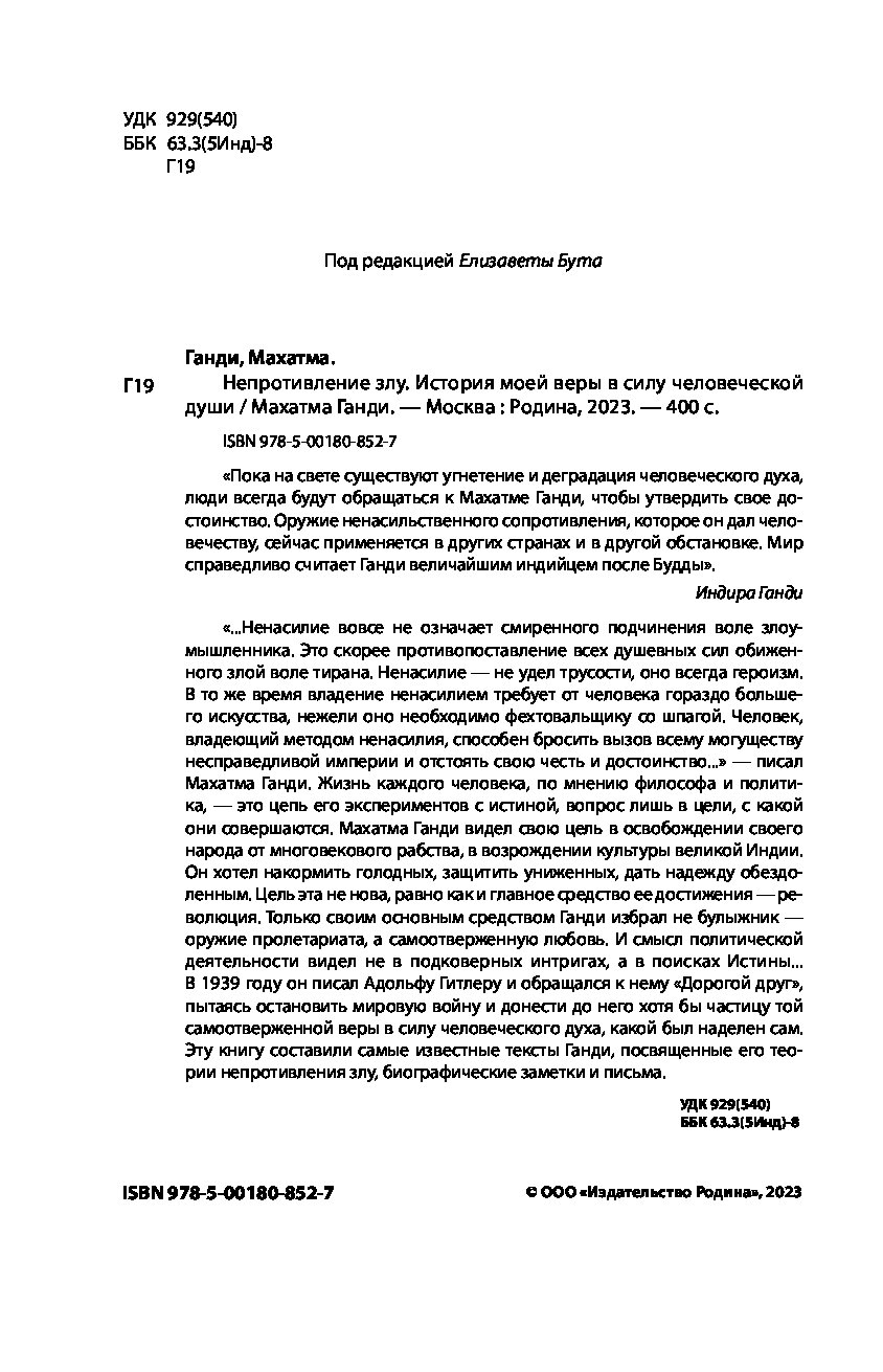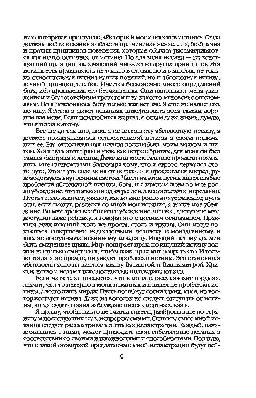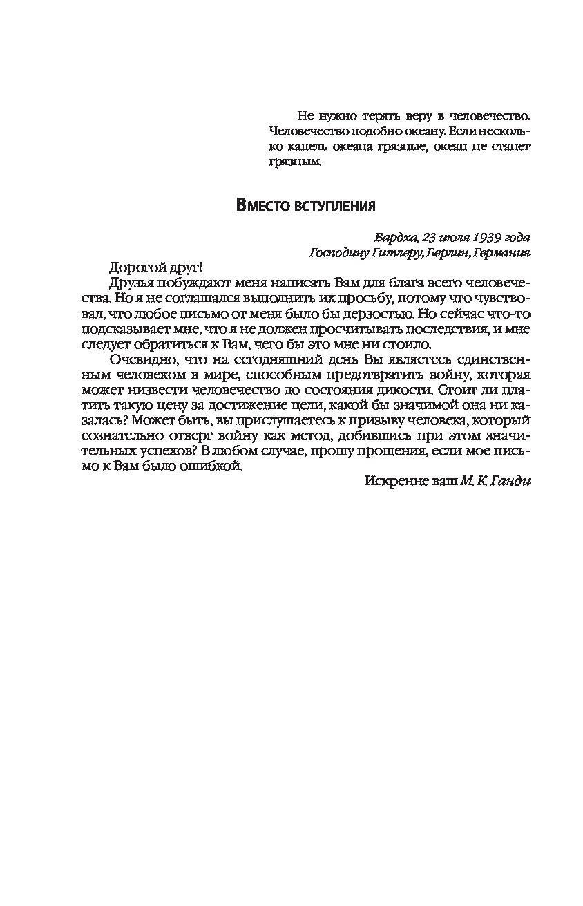 «...Ненасилие вовсе не означает смиренного подчинения воле злоумышленника. Это скорее противопоставление всех душевных сил обиженного злой воле тирана. Ненасилие — не удел трусости, оно всегда героизм. В то же время владение ненасилием требует от человека гораздо большего искусства, нежели оно необходимо фехтовальщику со шпагой. Человек, владеющий методом ненасилия, способен бросить вызов всему могуществу несправедливой империи и отстоять свою честь и достоинство...» — писал Махатма Ганди. Жизнь каждого человека, по мнению философа и политика, — это цепь его экспериментов с истиной, вопрос лишь в цели, с какой они совершаются. Махатма Ганди видел свою цель в освобождении своего народа от многовекового рабства, возрождении культуры великой Индии. Он хотел накормить голодных, защитить униженных, дать надежду обездоленным. Цель эта не нова, равно как и главное средство ее достижения — революция. Только своим основным средством Ганди избрал не булыжник — орудие пролетариата, а самоотверженную любовь. И смысл политической деятельности видел не в подковерных интригах, а в поисках Истины... В 1939-м году он писал Адольфу Гитлеру и обращался к нему «Дорогой друг», пытаясь остановить мировую войну и донести до него хотя бы частицу той самоотверженной веры в силу человеческого духа, какой был наделен сам. Эту книгу составили самые известные тексты Ганди, посвященные его теории непротивления злу, биографические заметки и письма.