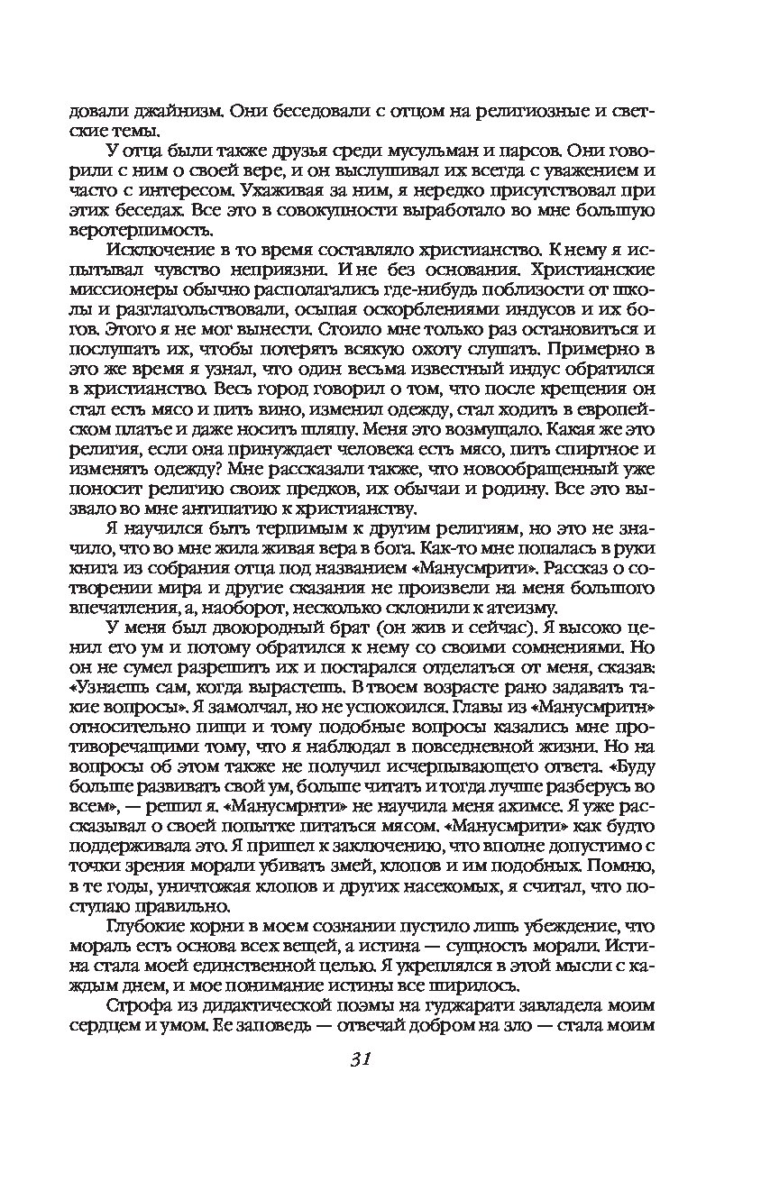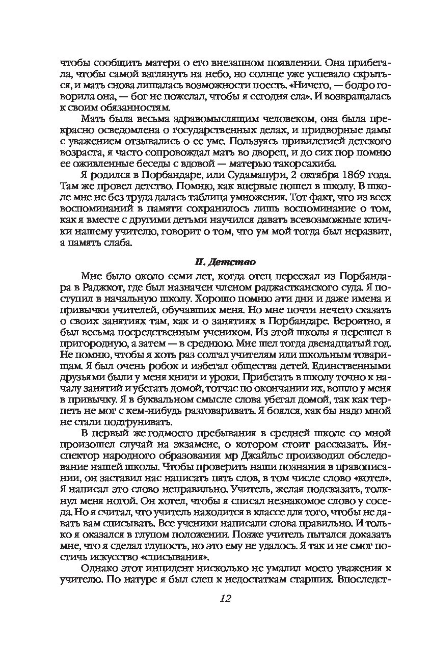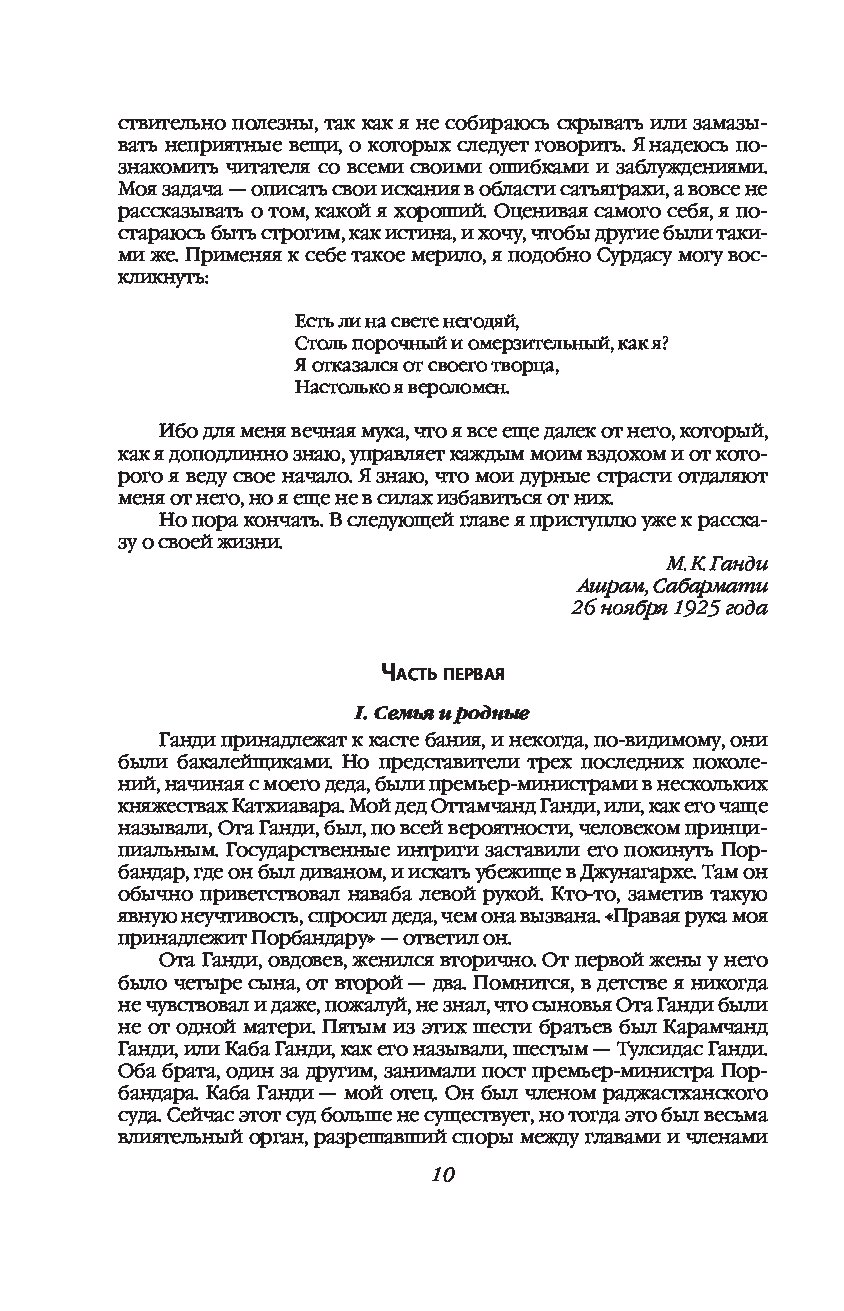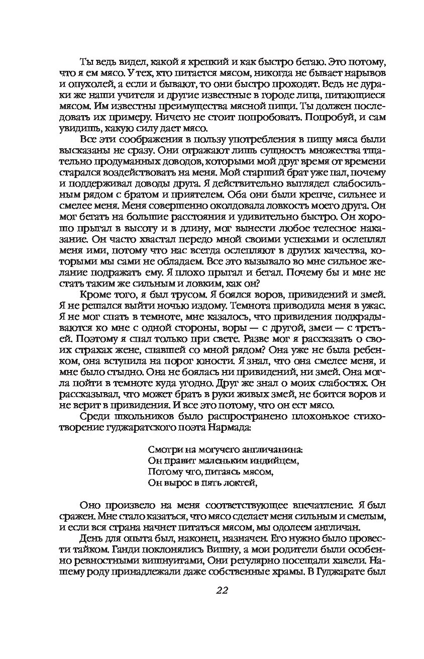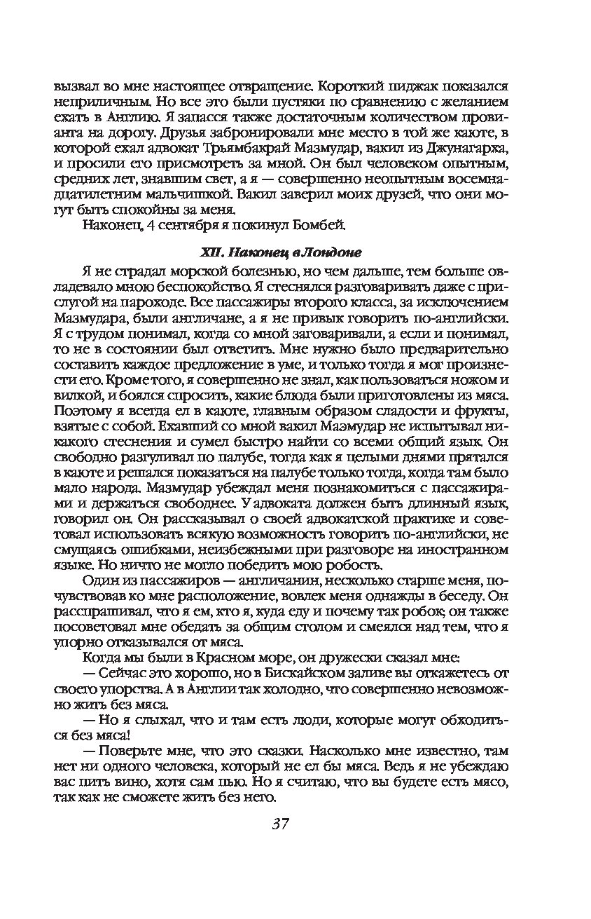 «...Ненасилие вовсе не означает смиренного подчинения воле злоумышленника. Это скорее противопоставление всех душевных сил обиженного злой воле тирана. Ненасилие — не удел трусости, оно всегда героизм. В то же время владение ненасилием требует от человека гораздо большего искусства, нежели оно необходимо фехтовальщику со шпагой. Человек, владеющий методом ненасилия, способен бросить вызов всему могуществу несправедливой империи и отстоять свою честь и достоинство...» — писал Махатма Ганди. Жизнь каждого человека, по мнению философа и политика, — это цепь его экспериментов с истиной, вопрос лишь в цели, с какой они совершаются. Махатма Ганди видел свою цель в освобождении своего народа от многовекового рабства, возрождении культуры великой Индии. Он хотел накормить голодных, защитить униженных, дать надежду обездоленным. Цель эта не нова, равно как и главное средство ее достижения — революция. Только своим основным средством Ганди избрал не булыжник — орудие пролетариата, а самоотверженную любовь. И смысл политической деятельности видел не в подковерных интригах, а в поисках Истины... В 1939-м году он писал Адольфу Гитлеру и обращался к нему «Дорогой друг», пытаясь остановить мировую войну и донести до него хотя бы частицу той самоотверженной веры в силу человеческого духа, какой был наделен сам. Эту книгу составили самые известные тексты Ганди, посвященные его теории непротивления злу, биографические заметки и письма.