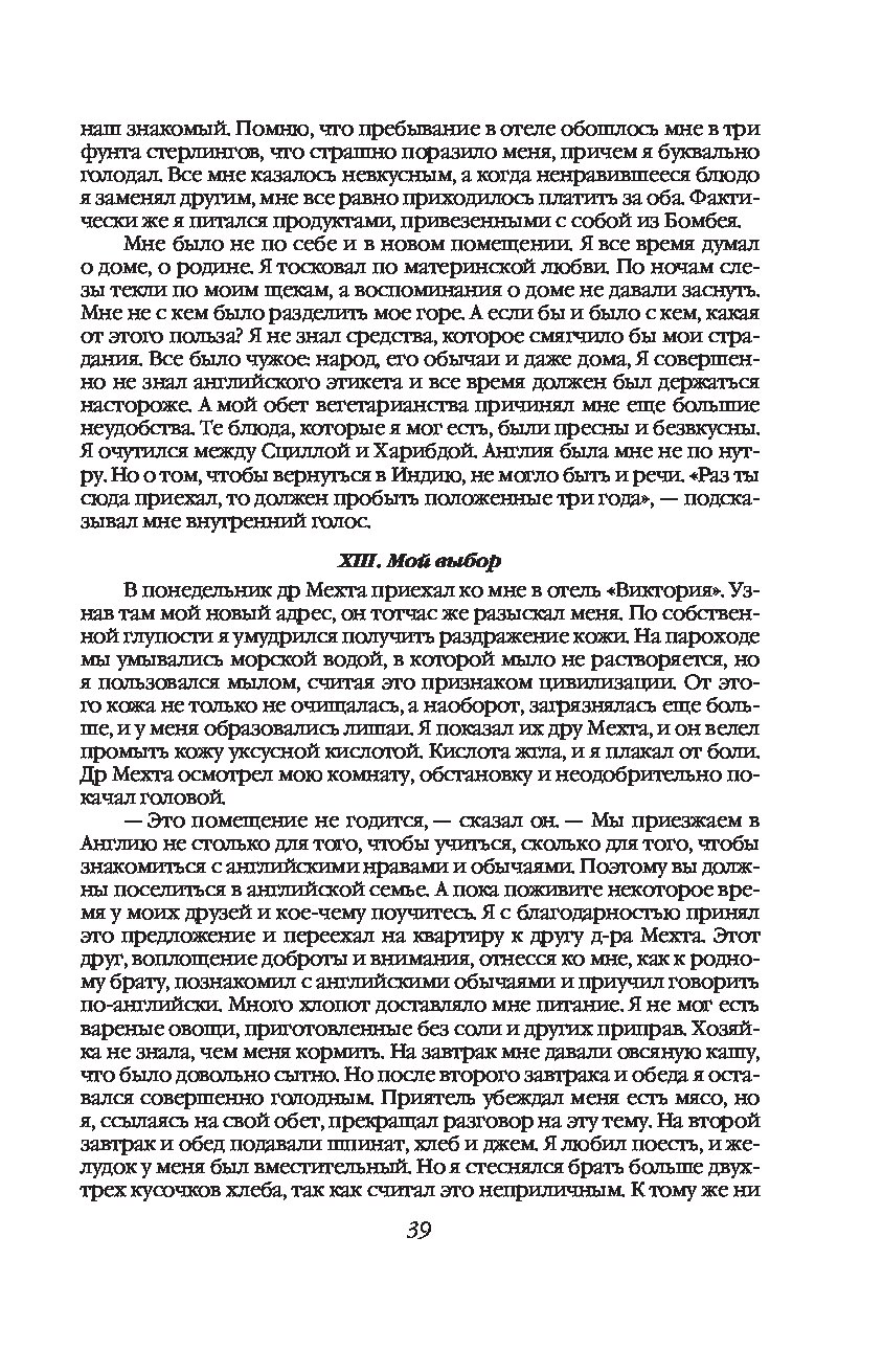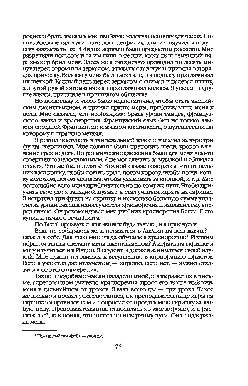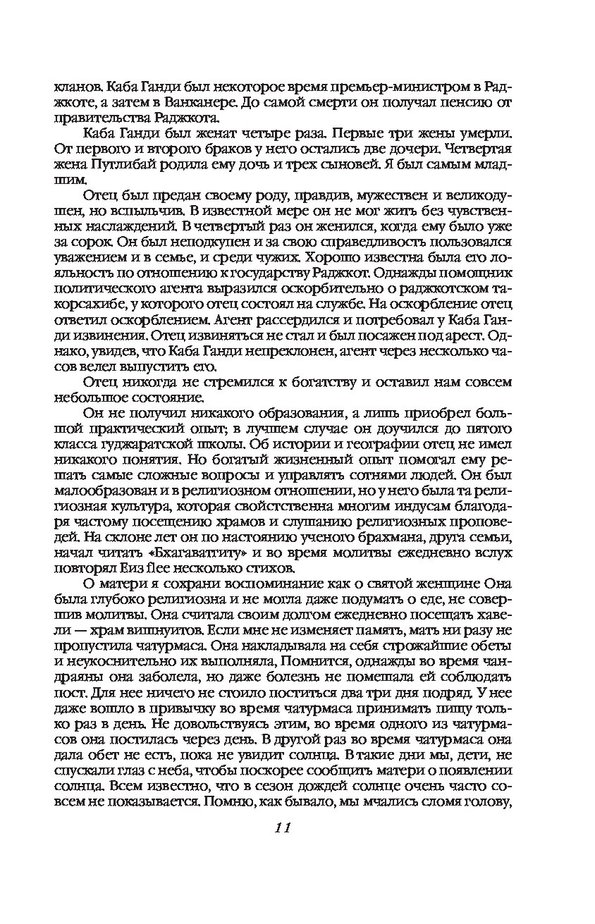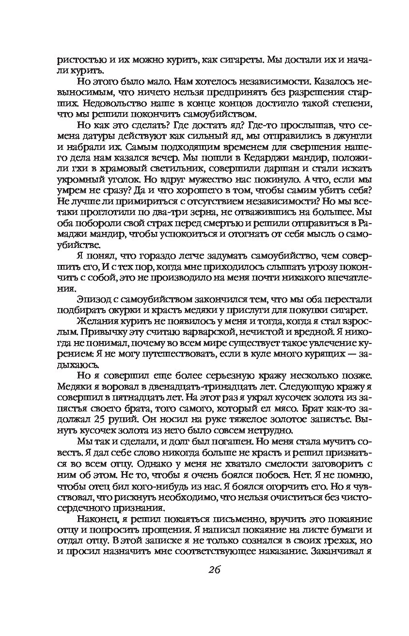 «...Ненасилие вовсе не означает смиренного подчинения воле злоумышленника. Это скорее противопоставление всех душевных сил обиженного злой воле тирана. Ненасилие — не удел трусости, оно всегда героизм. В то же время владение ненасилием требует от человека гораздо большего искусства, нежели оно необходимо фехтовальщику со шпагой. Человек, владеющий методом ненасилия, способен бросить вызов всему могуществу несправедливой империи и отстоять свою честь и достоинство...» — писал Махатма Ганди. Жизнь каждого человека, по мнению философа и политика, — это цепь его экспериментов с истиной, вопрос лишь в цели, с какой они совершаются. Махатма Ганди видел свою цель в освобождении своего народа от многовекового рабства, возрождении культуры великой Индии. Он хотел накормить голодных, защитить униженных, дать надежду обездоленным. Цель эта не нова, равно как и главное средство ее достижения — революция. Только своим основным средством Ганди избрал не булыжник — орудие пролетариата, а самоотверженную любовь. И смысл политической деятельности видел не в подковерных интригах, а в поисках Истины... В 1939-м году он писал Адольфу Гитлеру и обращался к нему «Дорогой друг», пытаясь остановить мировую войну и донести до него хотя бы частицу той самоотверженной веры в силу человеческого духа, какой был наделен сам. Эту книгу составили самые известные тексты Ганди, посвященные его теории непротивления злу, биографические заметки и письма.