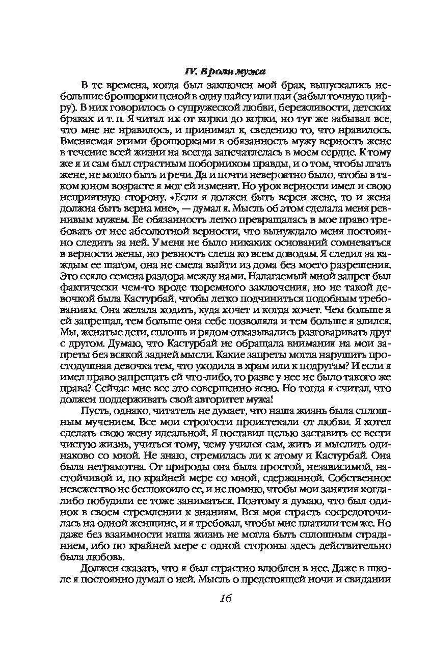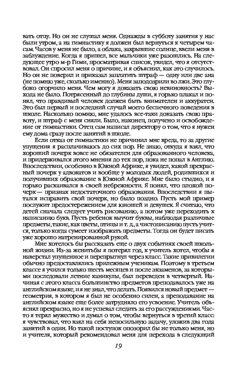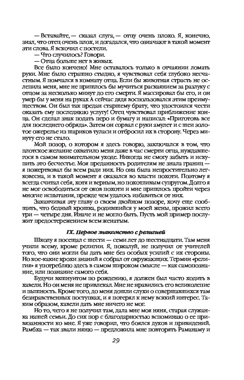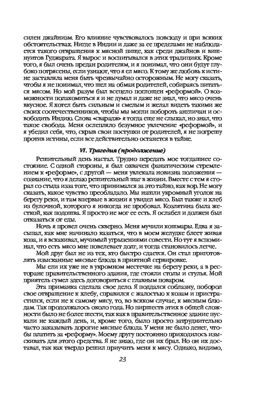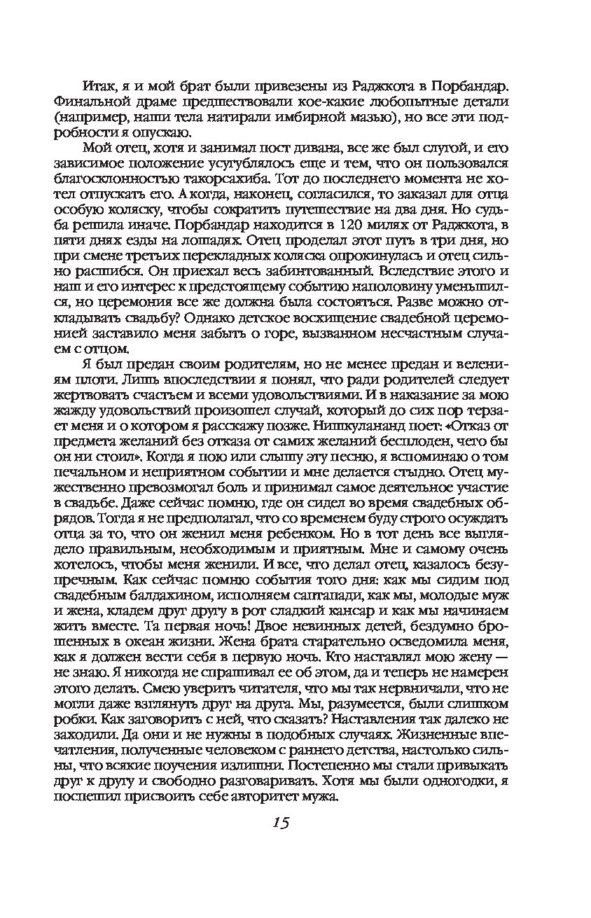 «...Ненасилие вовсе не означает смиренного подчинения воле злоумышленника. Это скорее противопоставление всех душевных сил обиженного злой воле тирана. Ненасилие — не удел трусости, оно всегда героизм. В то же время владение ненасилием требует от человека гораздо большего искусства, нежели оно необходимо фехтовальщику со шпагой. Человек, владеющий методом ненасилия, способен бросить вызов всему могуществу несправедливой империи и отстоять свою честь и достоинство...» — писал Махатма Ганди. Жизнь каждого человека, по мнению философа и политика, — это цепь его экспериментов с истиной, вопрос лишь в цели, с какой они совершаются. Махатма Ганди видел свою цель в освобождении своего народа от многовекового рабства, возрождении культуры великой Индии. Он хотел накормить голодных, защитить униженных, дать надежду обездоленным. Цель эта не нова, равно как и главное средство ее достижения — революция. Только своим основным средством Ганди избрал не булыжник — орудие пролетариата, а самоотверженную любовь. И смысл политической деятельности видел не в подковерных интригах, а в поисках Истины... В 1939-м году он писал Адольфу Гитлеру и обращался к нему «Дорогой друг», пытаясь остановить мировую войну и донести до него хотя бы частицу той самоотверженной веры в силу человеческого духа, какой был наделен сам. Эту книгу составили самые известные тексты Ганди, посвященные его теории непротивления злу, биографические заметки и письма.