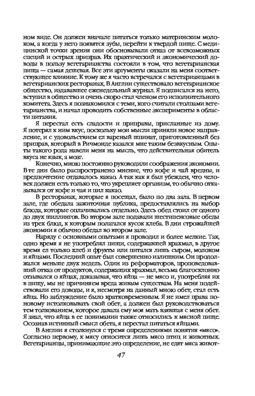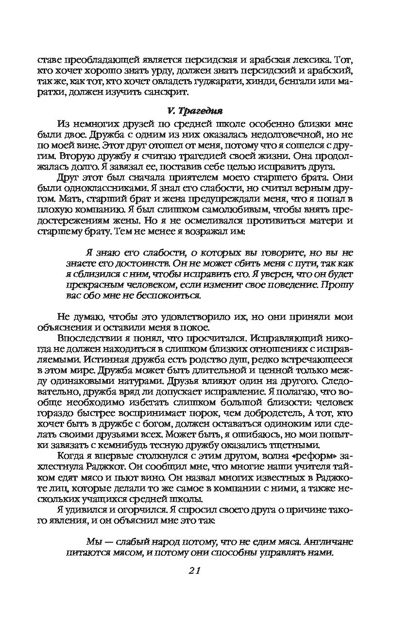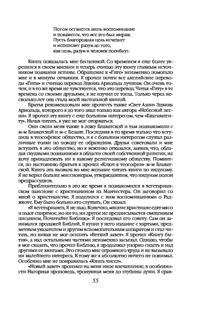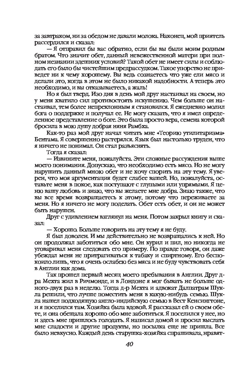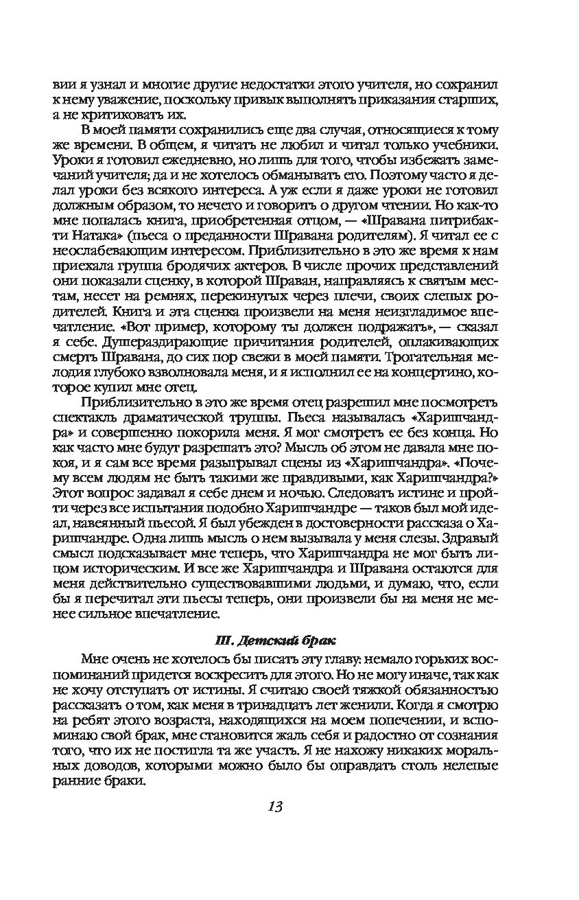 «...Ненасилие вовсе не означает смиренного подчинения воле злоумышленника. Это скорее противопоставление всех душевных сил обиженного злой воле тирана. Ненасилие — не удел трусости, оно всегда героизм. В то же время владение ненасилием требует от человека гораздо большего искусства, нежели оно необходимо фехтовальщику со шпагой. Человек, владеющий методом ненасилия, способен бросить вызов всему могуществу несправедливой империи и отстоять свою честь и достоинство...» — писал Махатма Ганди. Жизнь каждого человека, по мнению философа и политика, — это цепь его экспериментов с истиной, вопрос лишь в цели, с какой они совершаются. Махатма Ганди видел свою цель в освобождении своего народа от многовекового рабства, возрождении культуры великой Индии. Он хотел накормить голодных, защитить униженных, дать надежду обездоленным. Цель эта не нова, равно как и главное средство ее достижения — революция. Только своим основным средством Ганди избрал не булыжник — орудие пролетариата, а самоотверженную любовь. И смысл политической деятельности видел не в подковерных интригах, а в поисках Истины... В 1939-м году он писал Адольфу Гитлеру и обращался к нему «Дорогой друг», пытаясь остановить мировую войну и донести до него хотя бы частицу той самоотверженной веры в силу человеческого духа, какой был наделен сам. Эту книгу составили самые известные тексты Ганди, посвященные его теории непротивления злу, биографические заметки и письма.