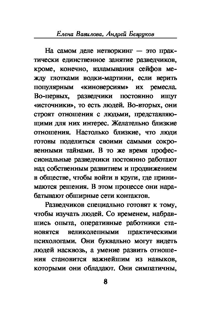 Офицеры разведки Елена Вавилова и Андрей Безруков стали известны во всем мире, когда их арестовали в США в 2010 г. Позднее они смогли вернуться в Россию. В этой книге авторы делятся уникальным личным опытом работы с людьми, накопленным за 25 лет службы под глубоким прикрытием.