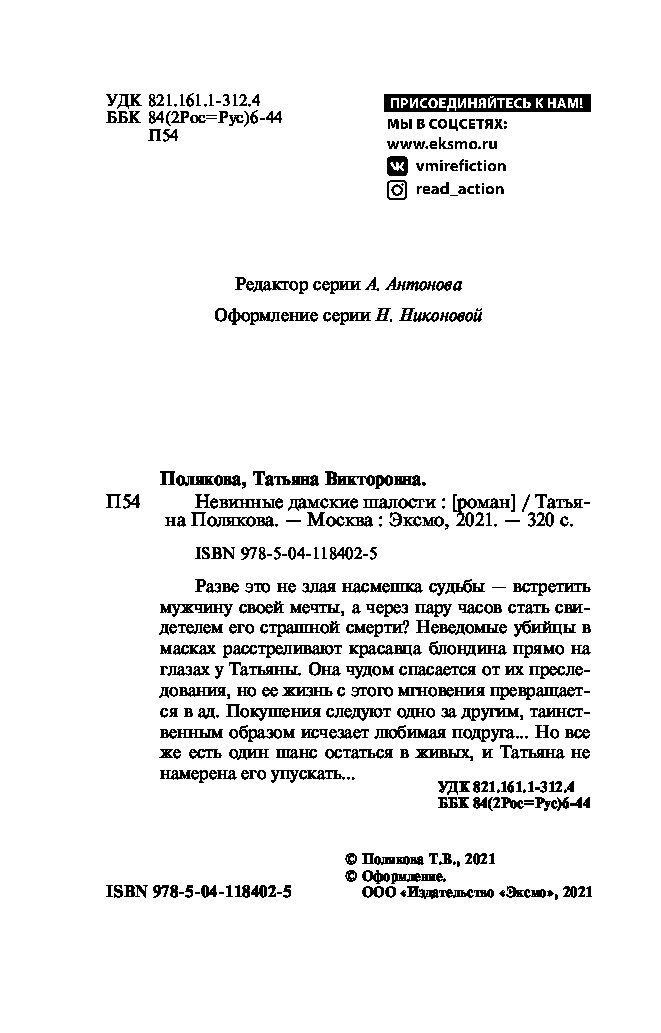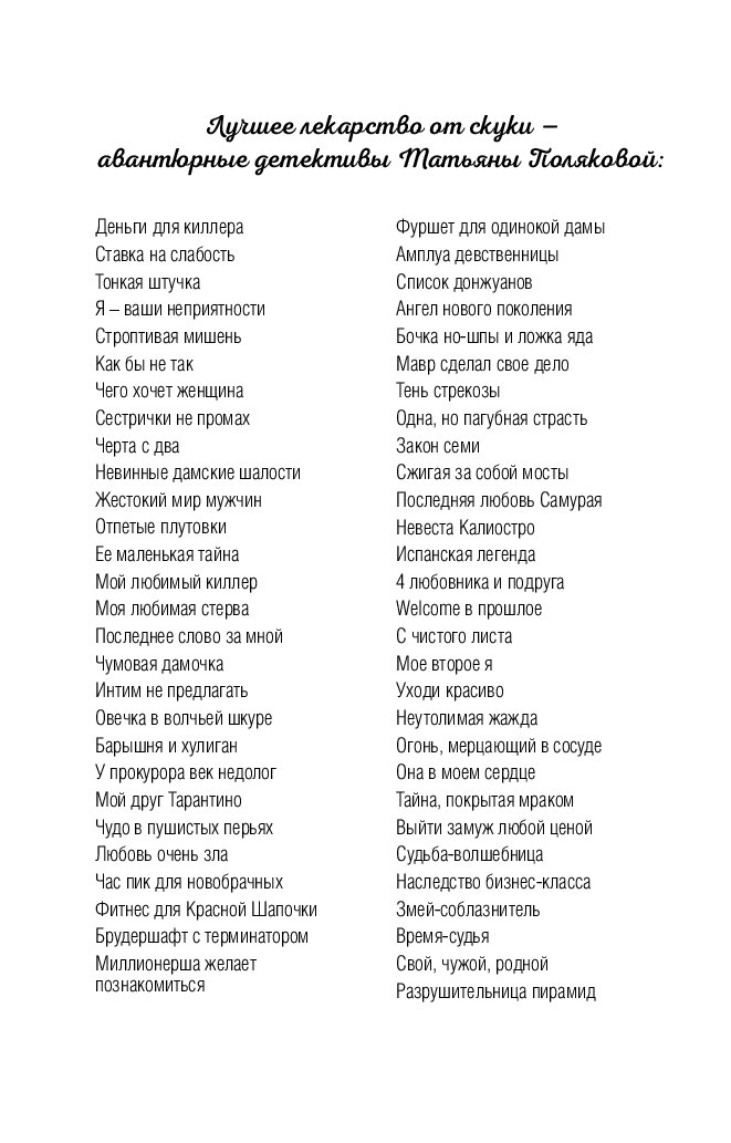 Татьяна Полякова — один из самых популярных российских писателей в жанре детектива. За время писательской карьеры из-под ее пера вышло более 85 книг общим тиражом более 36 миллионов экземпляров. По свидетельствам читателей, романы Татьяны Поляковой — это «захватывающий сюжет и непредсказуемая развязка, обаятельные герои и невероятные приключения, легкий стиль и яркие диалоги».