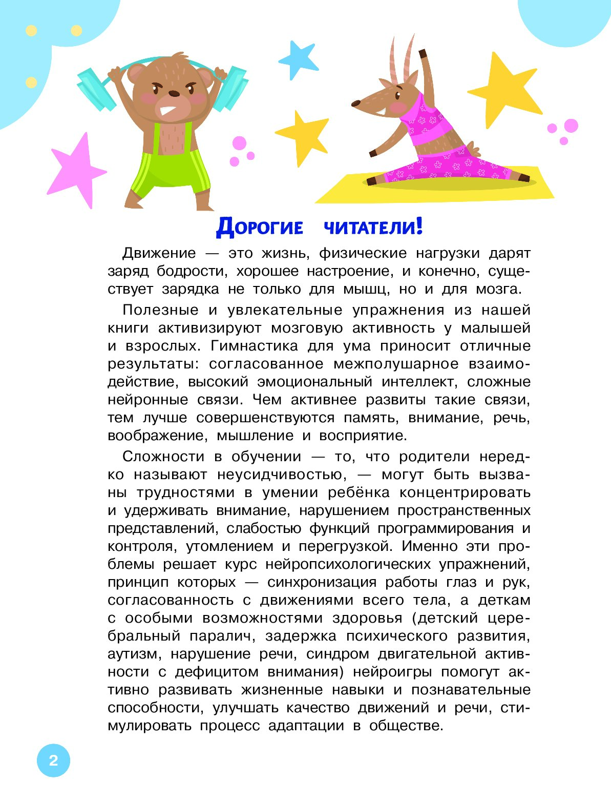 Сложности в обучении — то, что родители нередко называют невнимательностью и неусидчивостью, — могут быть вызваны трудностями в умении ребёнка концентрировать и удерживать внимание, нарушением пространственных представлений, слабостью функций программирования и контроля, утомлением и перегрузкой. Именно эти проблемы решает авторский курс нейропсихологических упражнений, принцип которых — синхронизация работы глаз и рук, согласованность с движениями всего тела.
