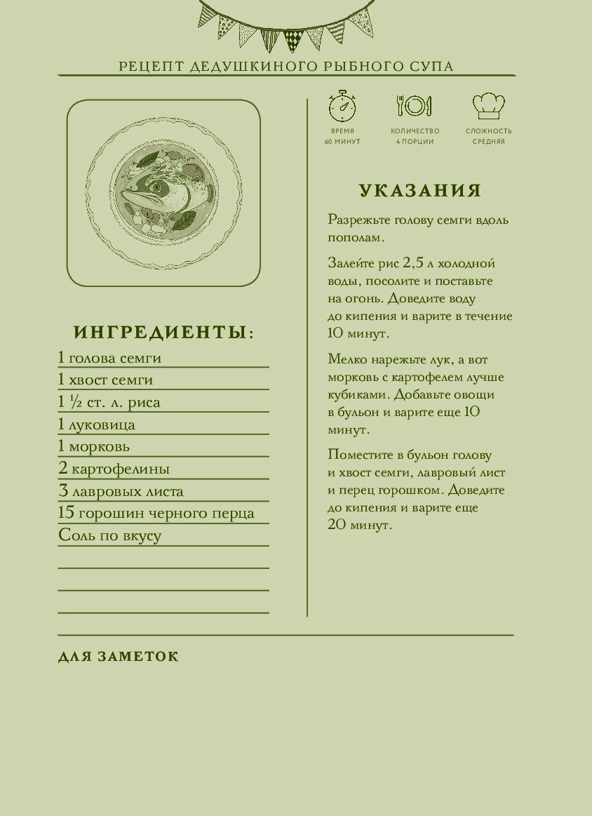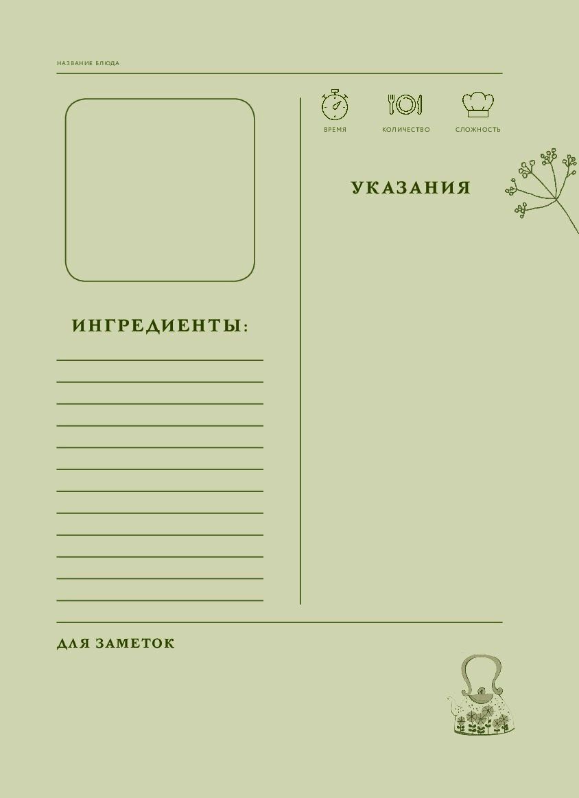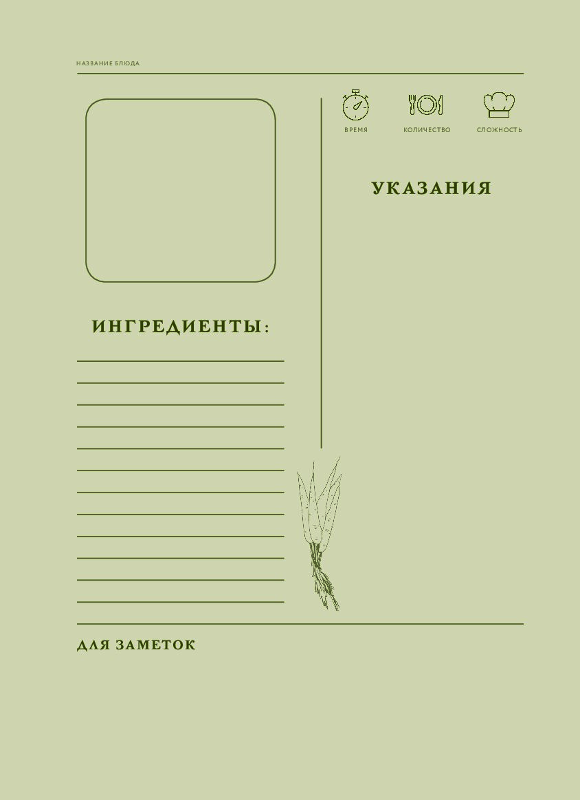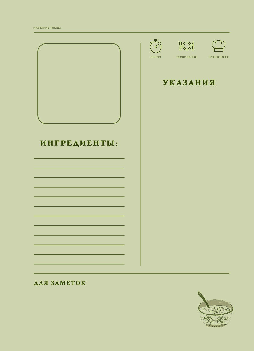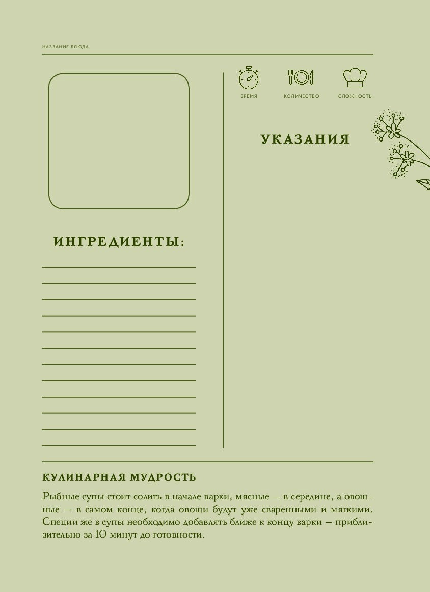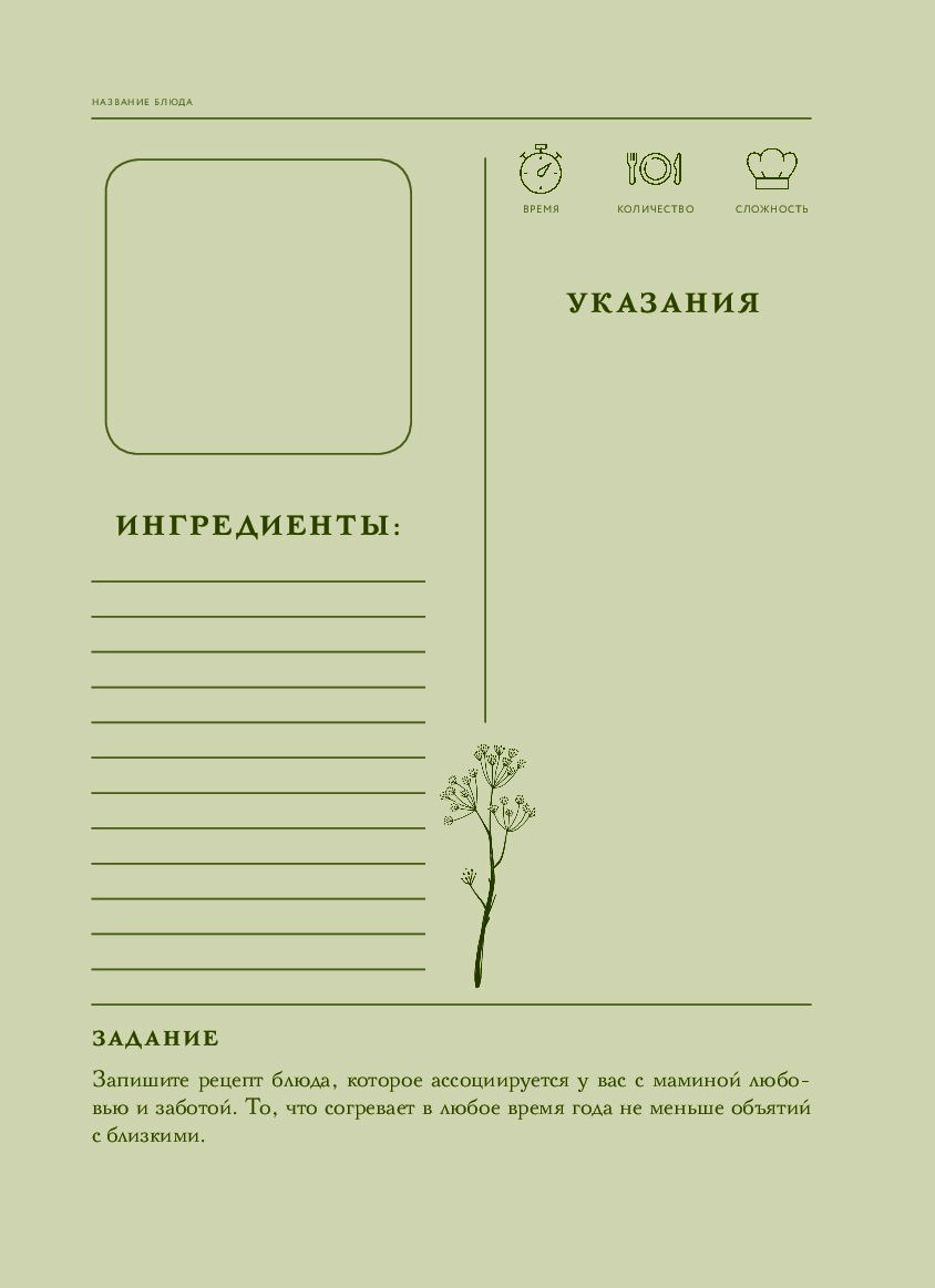 Внутри вы найдете тематические задания и вопросы для сближения, рецепты и советы по приготовлению, а также удобные поля для записи ваших собственных кулинарных шедевров.