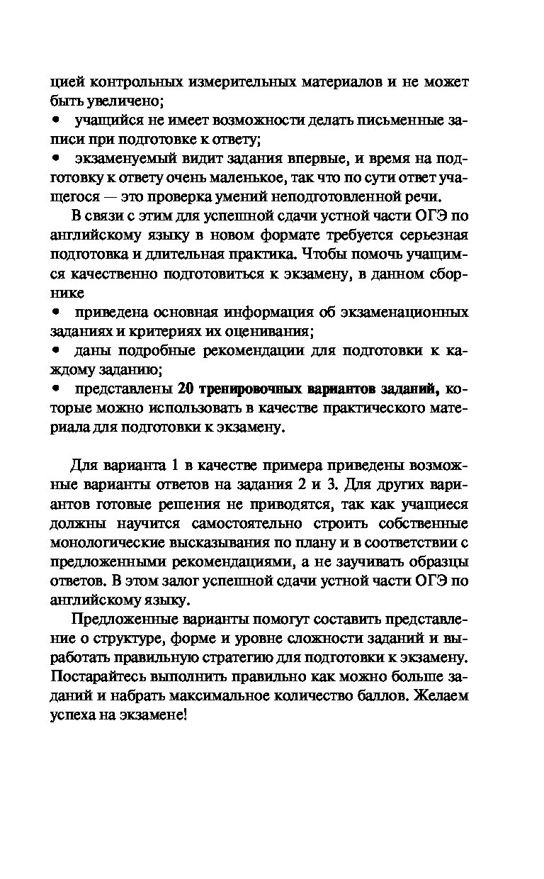 Вниманию учащихся 9 классов образовательных организаций  предлагается пособие для подготовки к  основному государственному экзамену по английскому языку, которое содержит 20 тренировочных  вариантов  устной части ОГЭ. Предложенные варианты помогут составить представление о структуре, числе, форме и уровне сложности заданий и предоставляют отличную возможность для овладения необходимыми умениями и навыками для их успешного выполнения. Сборник содержит подробные рекомендации по подготовке к чтению текста, ответам на  вопросы заданий и построению монологического высказывания. Полезная справочная информация  облегчит  подготовку к экзамену. Сборник будет полезен учителям, которые найдут в нем необходимый материал для работы на уроках.