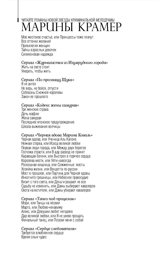 В современном мире женщина не может позволить себе роскошь быть слабой. Героини романов Марины Крамер преодолеют любые препятствия на пути к своей цели, заставят считаться с собою каждого, кто захочет перейти им дорогу. Любовь таких женщин обжигающе горяча, а власть над мужчинами – безгранична.