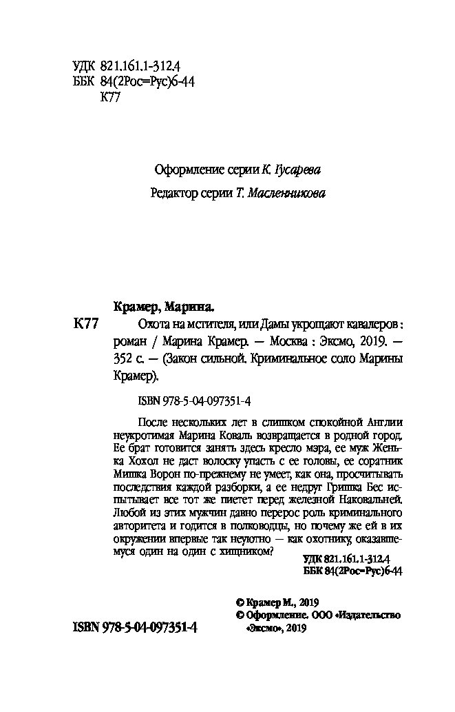 —Книга «Охота на мстителя, или Дамы укрощают кавалеров» Крамер М.
