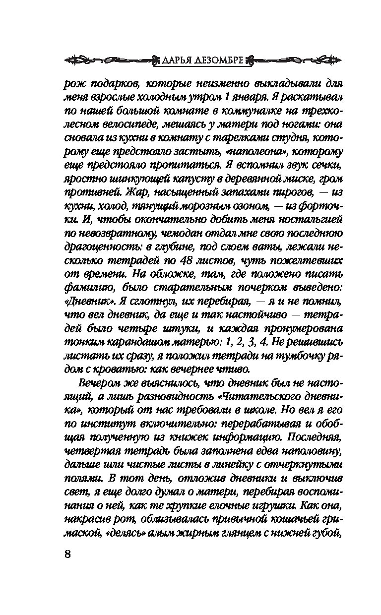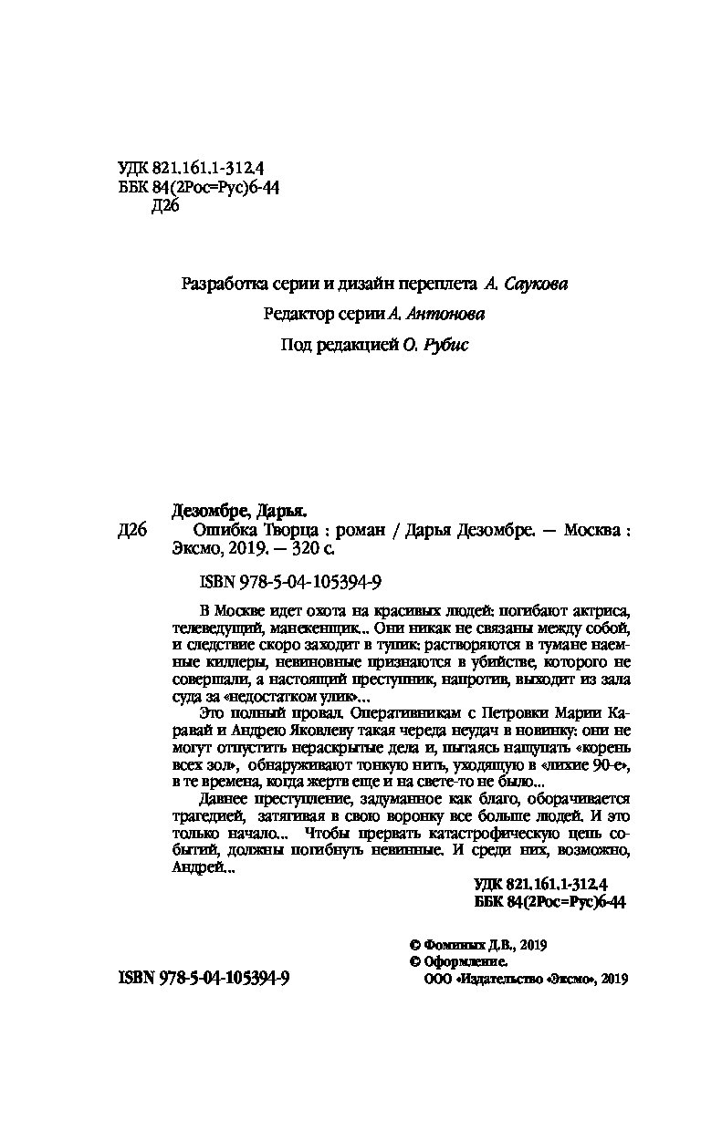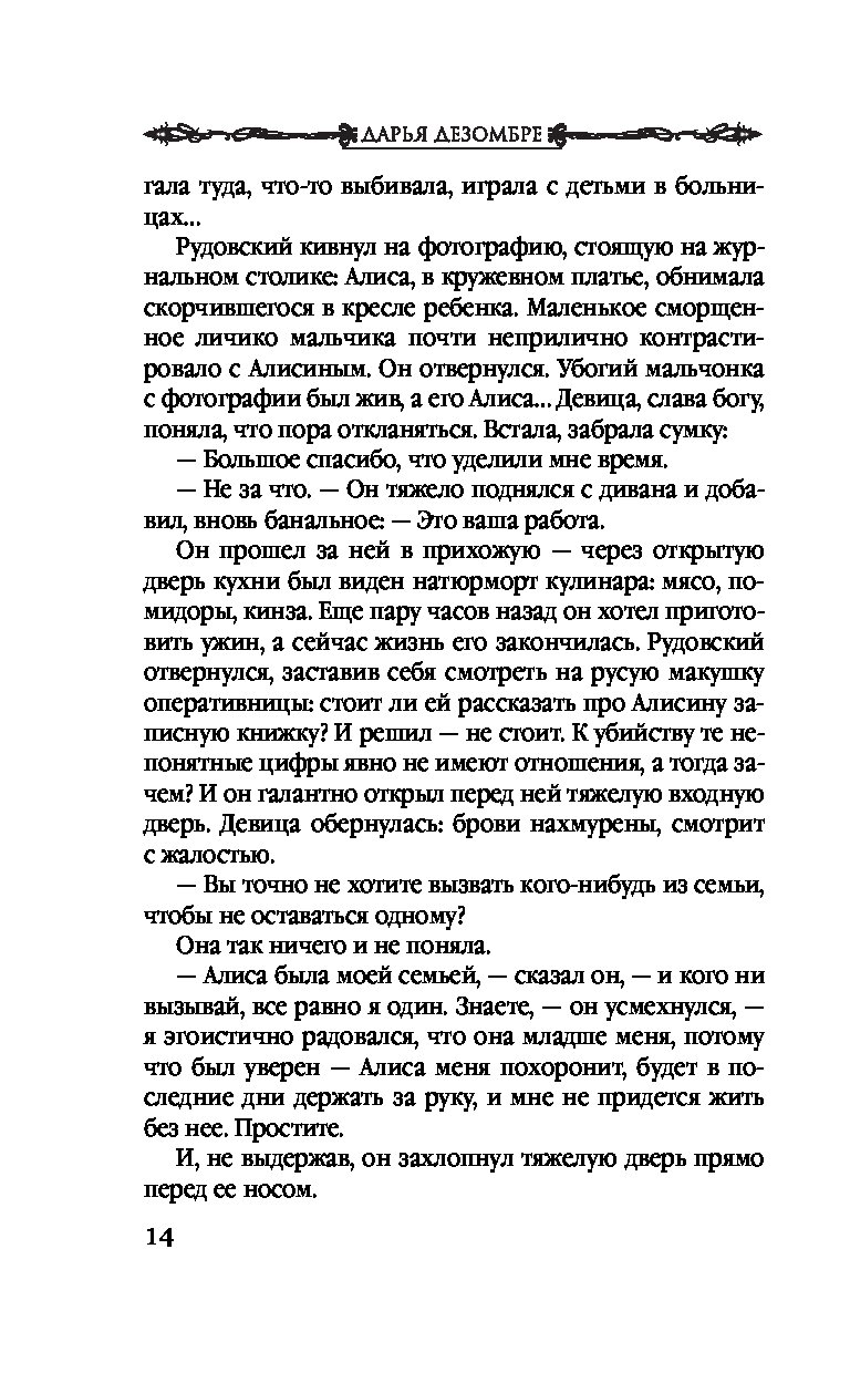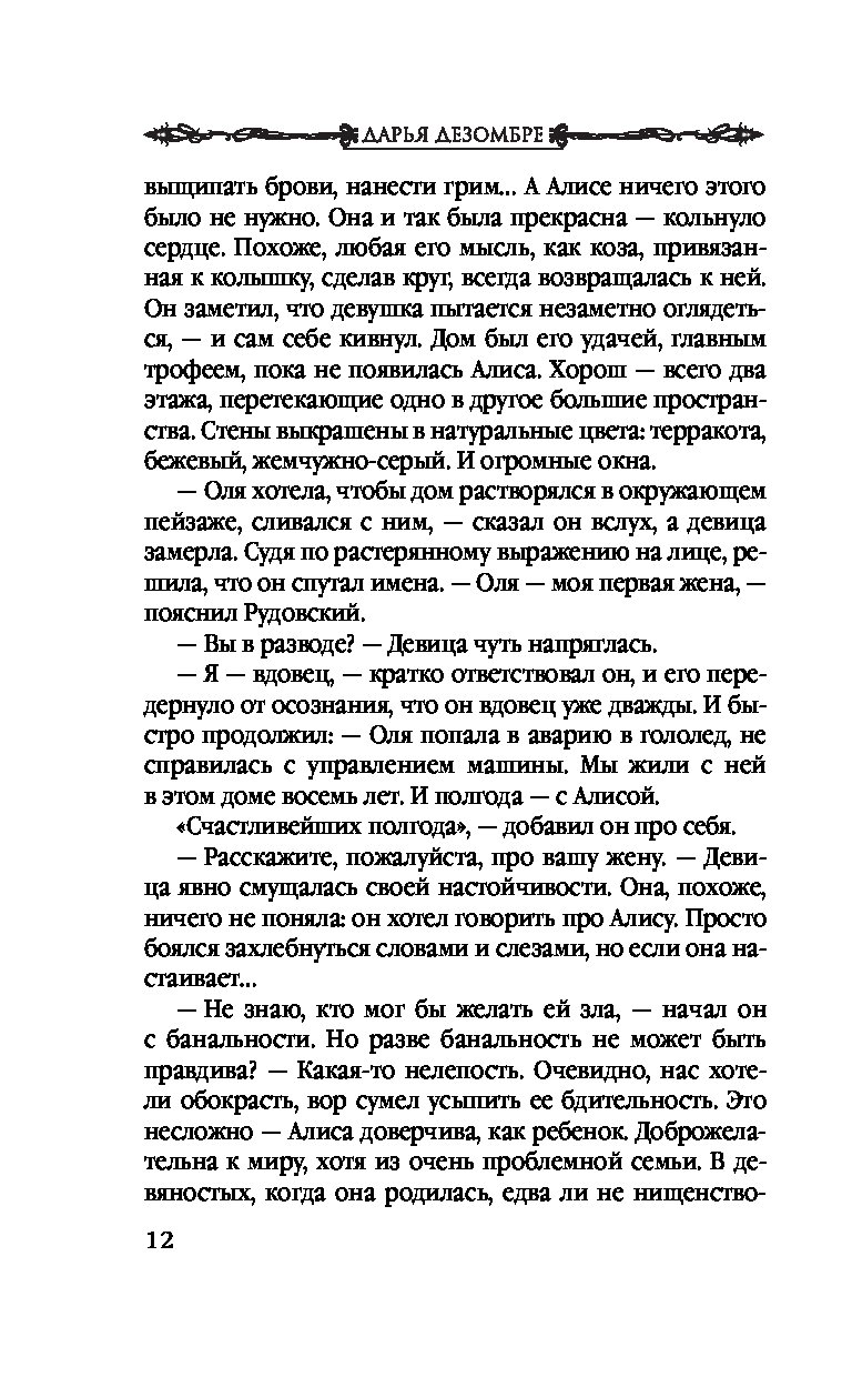 "Об авторе: Дарья Дезомбре – писатель-эстет, автор интеллектуальных детективов, получивших признание и популярность среди думающих читателей, любителей тонкой интриги, мистических тайн, детальных экскурсов в историю, культуру и искусство. Все книги автора переведены на иностранные языки и активно издаются в Европе.