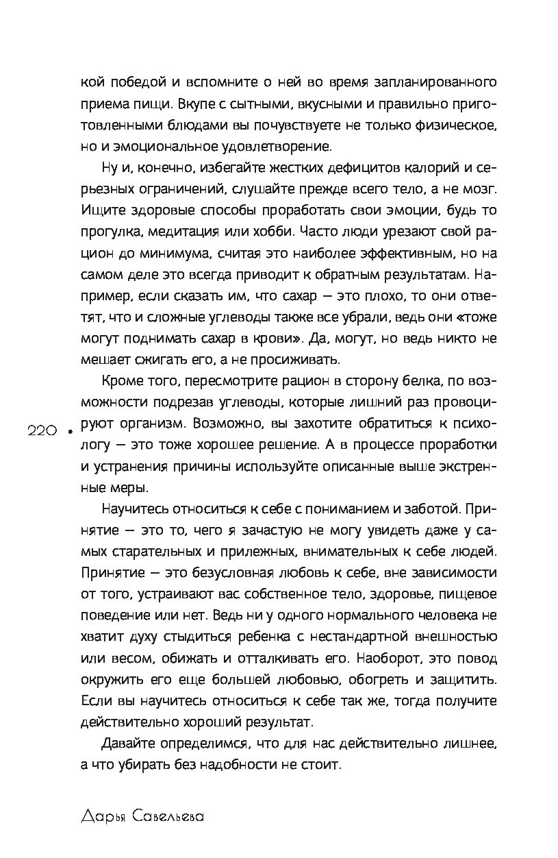 Задача Дарьи и настоящего руководства – помочь вам обрести стройность плавно, уверенно и на такой срок, на какой вы сами захотите. Вы разберетесь в основах работы человеческого организма и метаболических процессов в частности и поймете, почему беспокоиться нужно в первую очередь не из-за лишнего веса, а из-за того, какие проблемы и неверные решения нас к нему приводят. Автор призывает читателей не действовать по шаблонам из интернета, не сидеть на опасных диетах, владеть достоверной информацией и обдумывать каждое свое действие. Осознанное питание и правильный образ жизни — это не навязанные кем-то правила и идеалы, а ваш собственный путь!