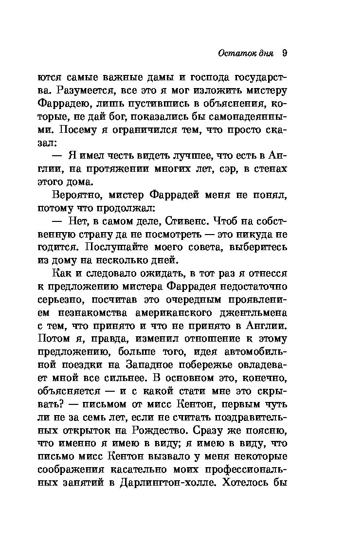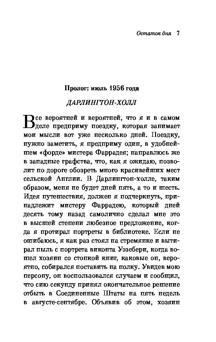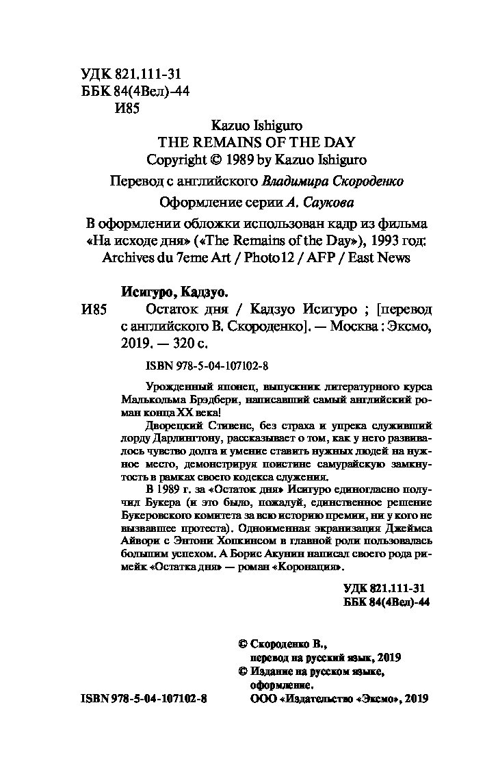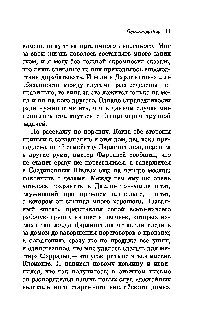 Самый английский роман конца XX века. Дворецкий Стивенс, без страха и упрека служивший лорду Дарлингтону, рассказывает о том, как у него развивалось чувство долга и умение ставить нужных людей на нужное место, демонстрируя поистине самурайскую замкнутость в рамках своего кодекса служения.