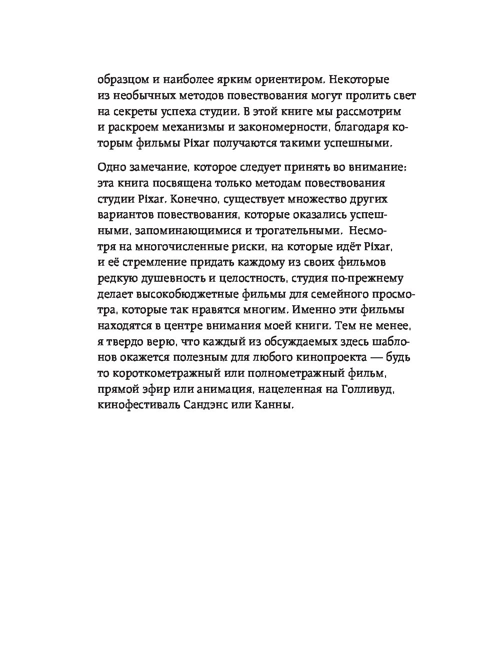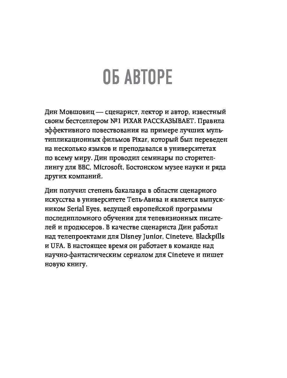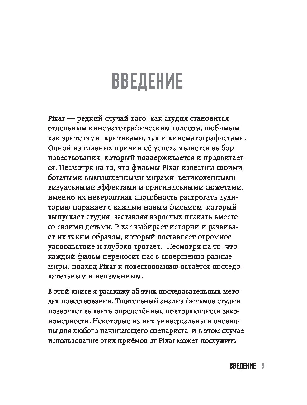 Бестселлер Амазона! 10 глав — 10 советов, каждый из которых аргументируется на основе уже существующих анимационных фильмов компании. Будет интересна начинающим писателям и сценаристам, которые хотят научиться рассказывать истории, а также поклонникам мультфильмов Pixar, которым интересно узнать больше о создании их любимых историй. В обновленном дополненном издании автор книги добавил разбор новинок студии, таких как «История игрушек 4», «Вперед», «Душа», «Базз Лайтер» и «Элементарно»!