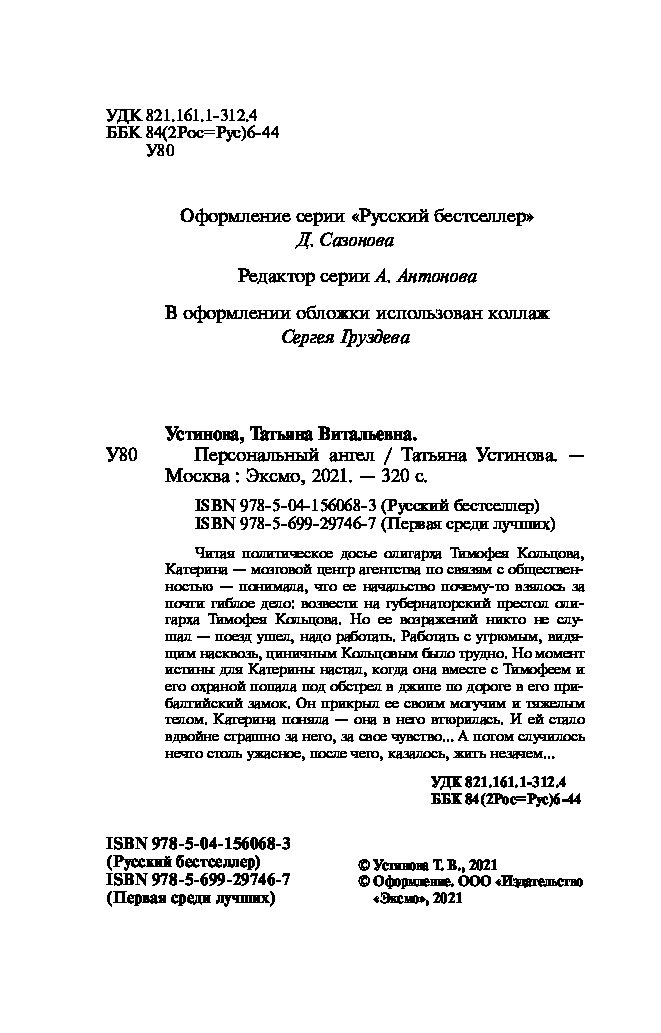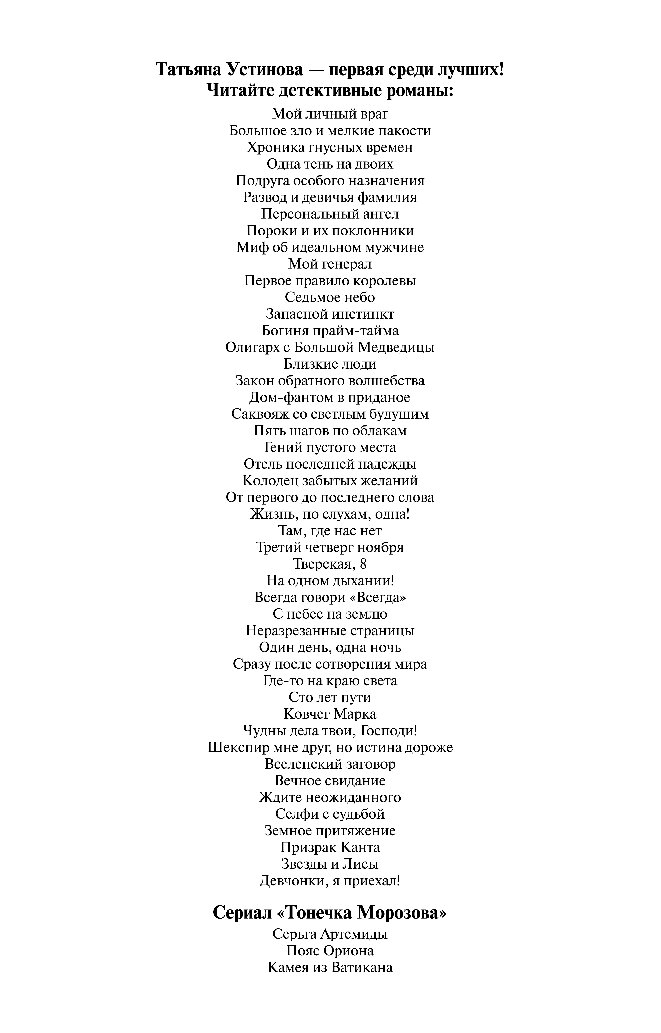 Татьяна Устинова — один из топовых авторов современной российской прозы, обладатель двух премий «Электронная буква», лауреат «ТЭФИ» в номинации «Сценарист телевизионного фильма». «Первая среди лучших» — так называют Татьяну Витальевну, и это не просто остроумный эпитет, а звание, подтвержденное десятками написанных романов, успешными экранизациями и, конечно, любовью многочисленных поклонников ее творчества.