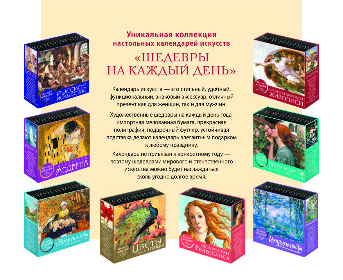 подарочных календарей «Шедевры на каждый день». И пусть утонченный и изысканный дух великих художников вдохновит вас на большие планы и смелые решения.