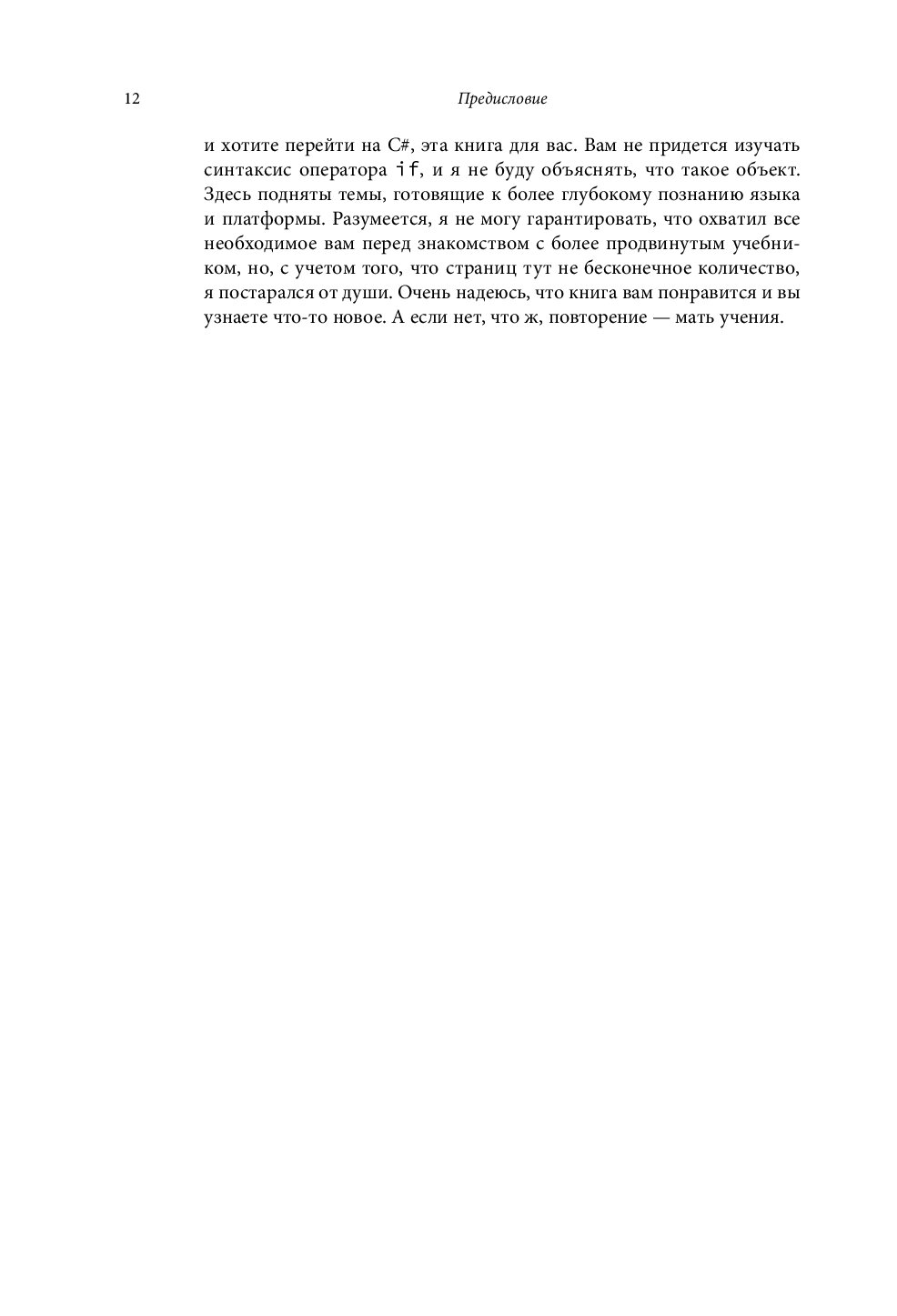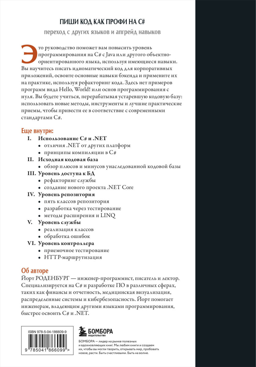 Это руководство поможет вам повысить уровень программирования на C# с Java или другого объектно-ориентированного языка, используя имеющиеся навыки. Вы научитесь писать идиоматический код для корпоративных приложений, освоите основные навыки бэкенда и примените их на практике, используя рефакторинг кода. Здесь нет примеров программ вида Hello, World! или основ программирования с нуля. Вы будете учиться, перерабатывая устаревшую кодовую базу: использовать новые методы, инструменты и лучшие практические приемы, чтобы привести ее в соответствие с современными стандартами C#.