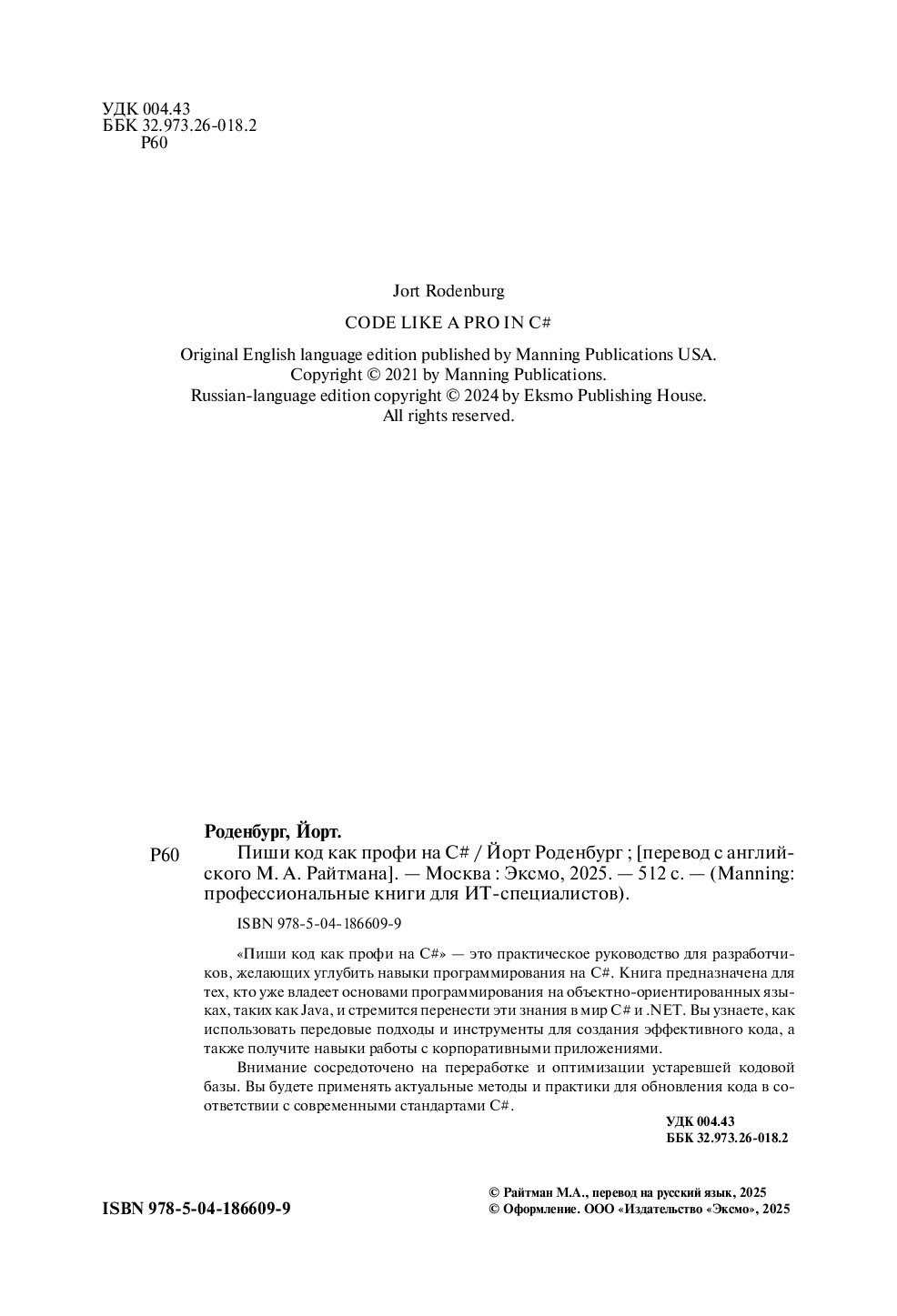Йорт РОДЕНБУРГ — инженер-программист, писатель и лектор. Специализируется на C# и разработке ПО в различных сферах, таких как финансы и отчетность, медицинская визуализация, распределенные системы и кибербезопасность. Йорт помогает инженерам, владеющим другими языками программирования, быстрее освоить C# и .NET.