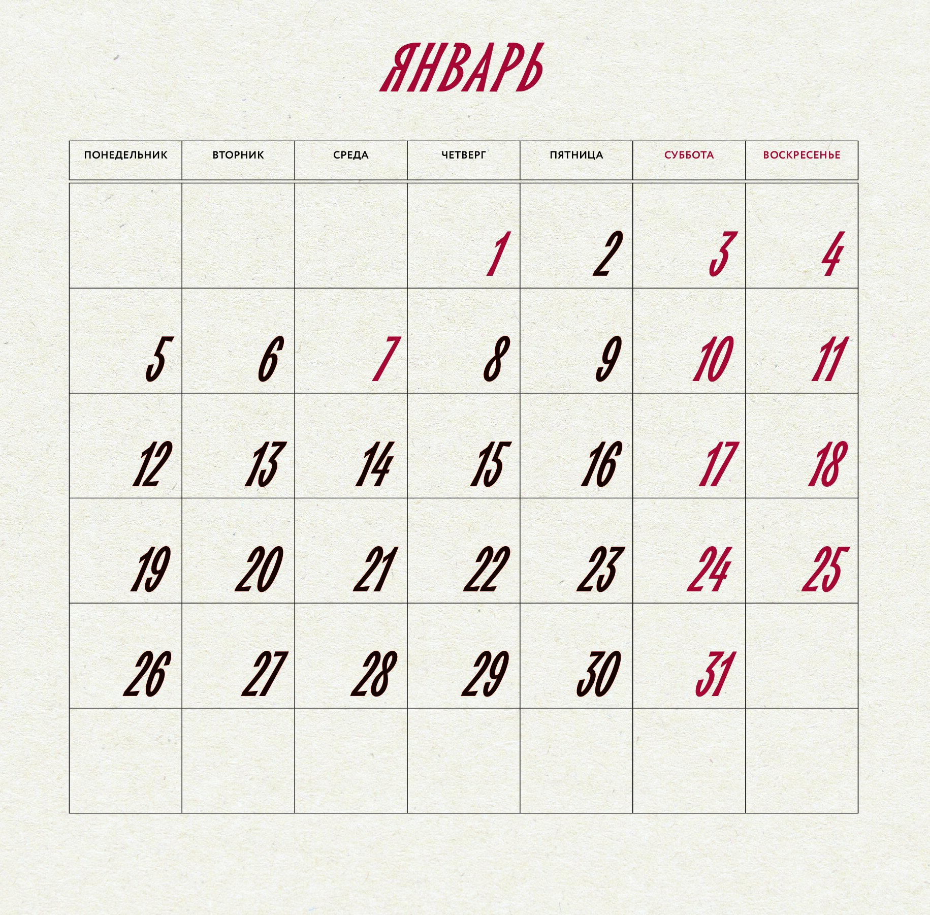 - Календарная сетка — с разбивкой по месяцам.