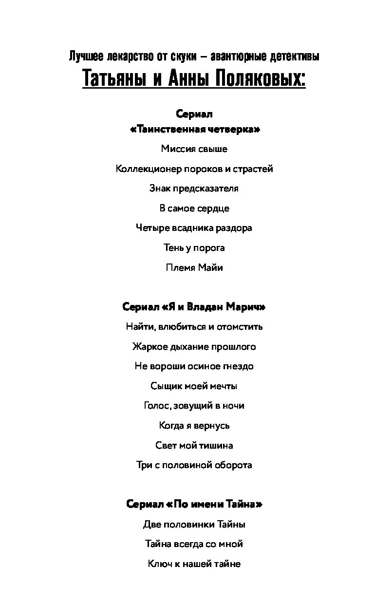 Новая закрученная история с участием героев Таинственной четверки от Татьяной Поляковой! Ироничный детектив о поиске своих корней и неожиданных поворотах судьбы.
