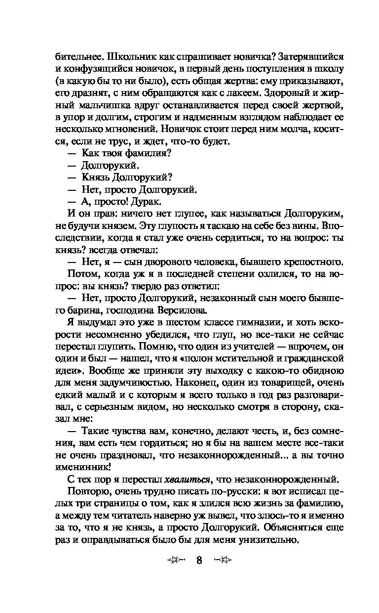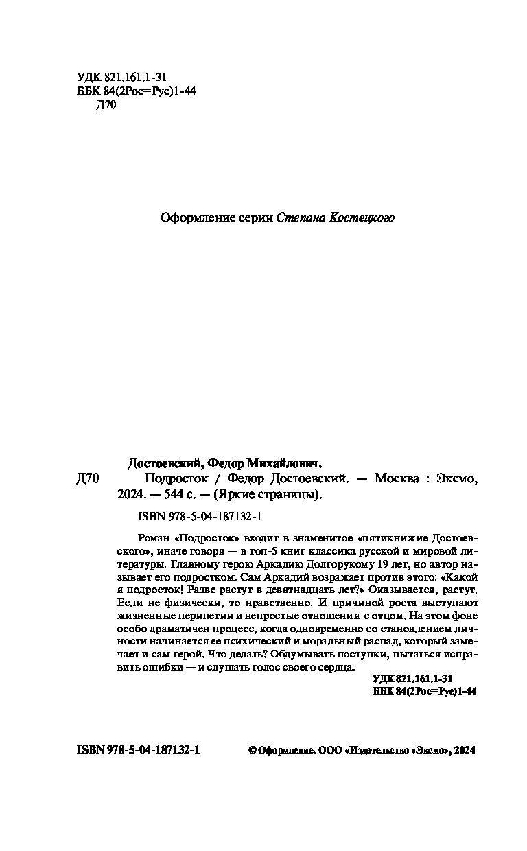 Роман «Подросток» входит в знаменитое «пятикнижие Достоевского», иначе говоря — в Топ-5 книг классика русской и мировой литературы. Главному герою Аркадию Долгорукому 19 лет, но автор называет его подростком. Сам Аркадий возражает против этого: «Какой я подросток! Разве растут в девятнадцать лет?» Оказывается, растут. Если не физически, то нравственно. И причиной роста выступают жизненные перипетии и непростые отношения  с отцом. На этом фоне особо драматичен процесс, когда одновременно со становлением личности начинается ее психический и моральный распад, который замечает и сам герой. Что делать? Обдумывать поступки, пытаться исправить ошибки — и слушать голос своего сердца.