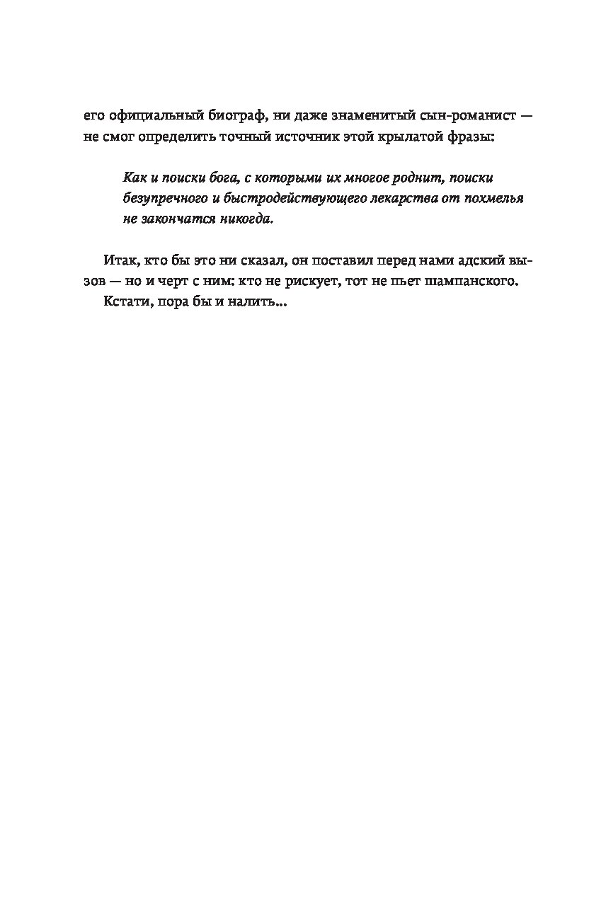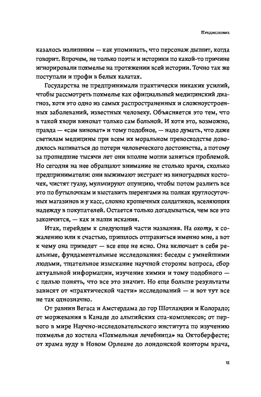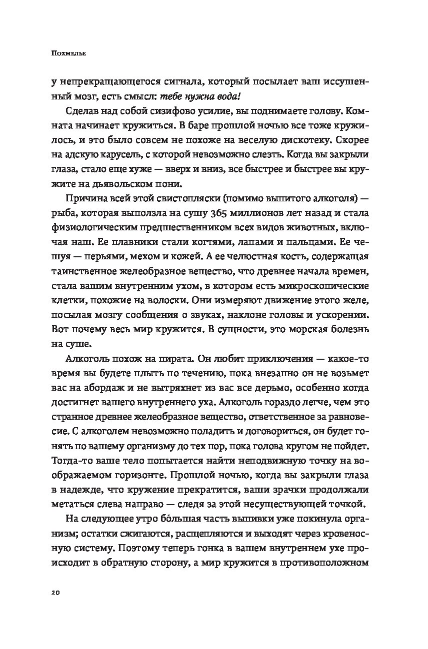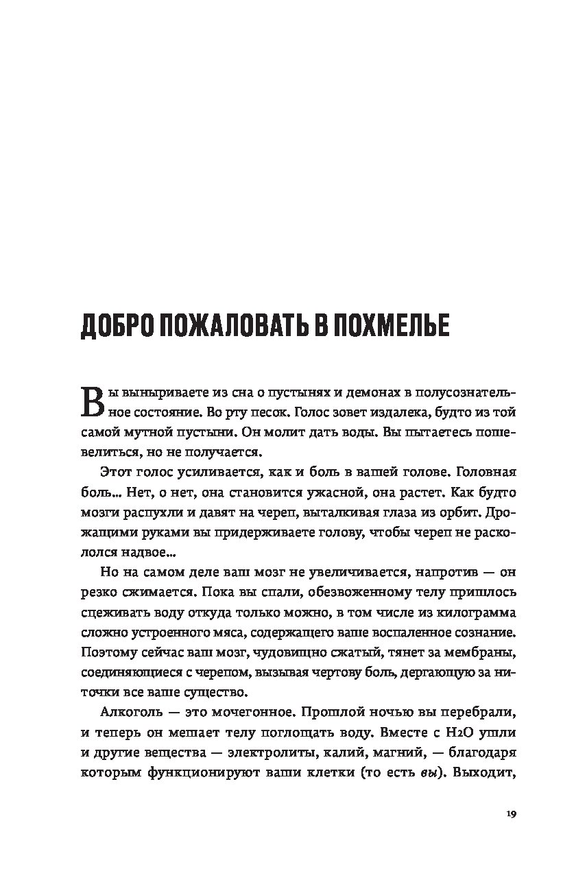 Кто сталкивался с похмельем, знает: редко человек чувствует себя столь одиноко, скверно и ничтожно. Что может помочь? Витаминные инъекции? Гоголь-моголь? Опохмел? Шоковая терапия? В поисках идеального лекарства Шонесси Бишоп-Столл испробовал всё и даже переусердствовал. Виражи в боевом самолете, прыжок с небоскреба, заплыв моржей, визит к жрице вуду… Его исследование охватило десятки стран и все возможные способы поставить себя на ноги. Книгу, оплаченную здоровьем автора, дополняет культурная и медицинская история похмелья и попыток с ним справиться. Из самого длинного естествоиспытательского запоя, которое только видело человечество, Бишоп-Столл вынырнул не только с остроумной книгой о том, что беспокоит столь многих, но и с собственным рецептом, призванным избавить страждущих от мучений.