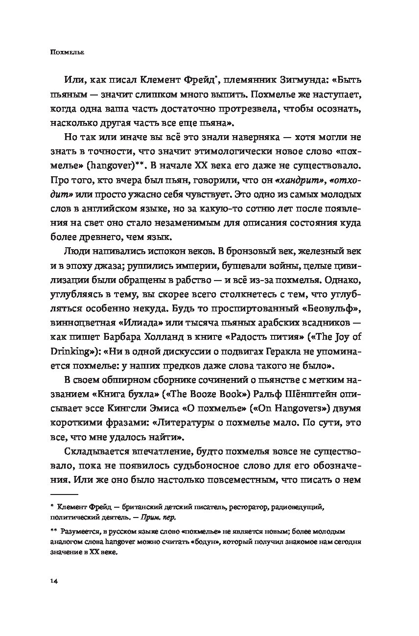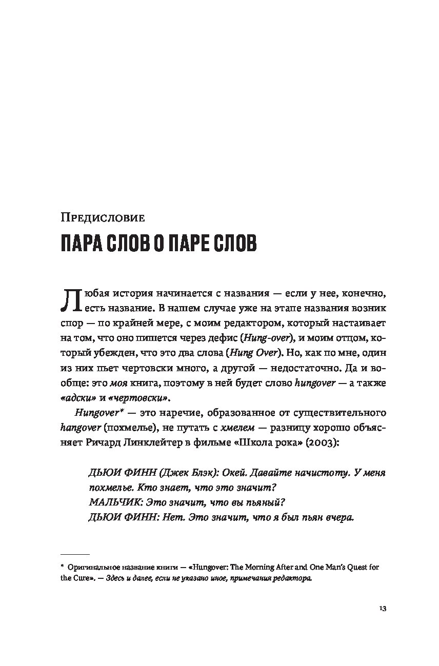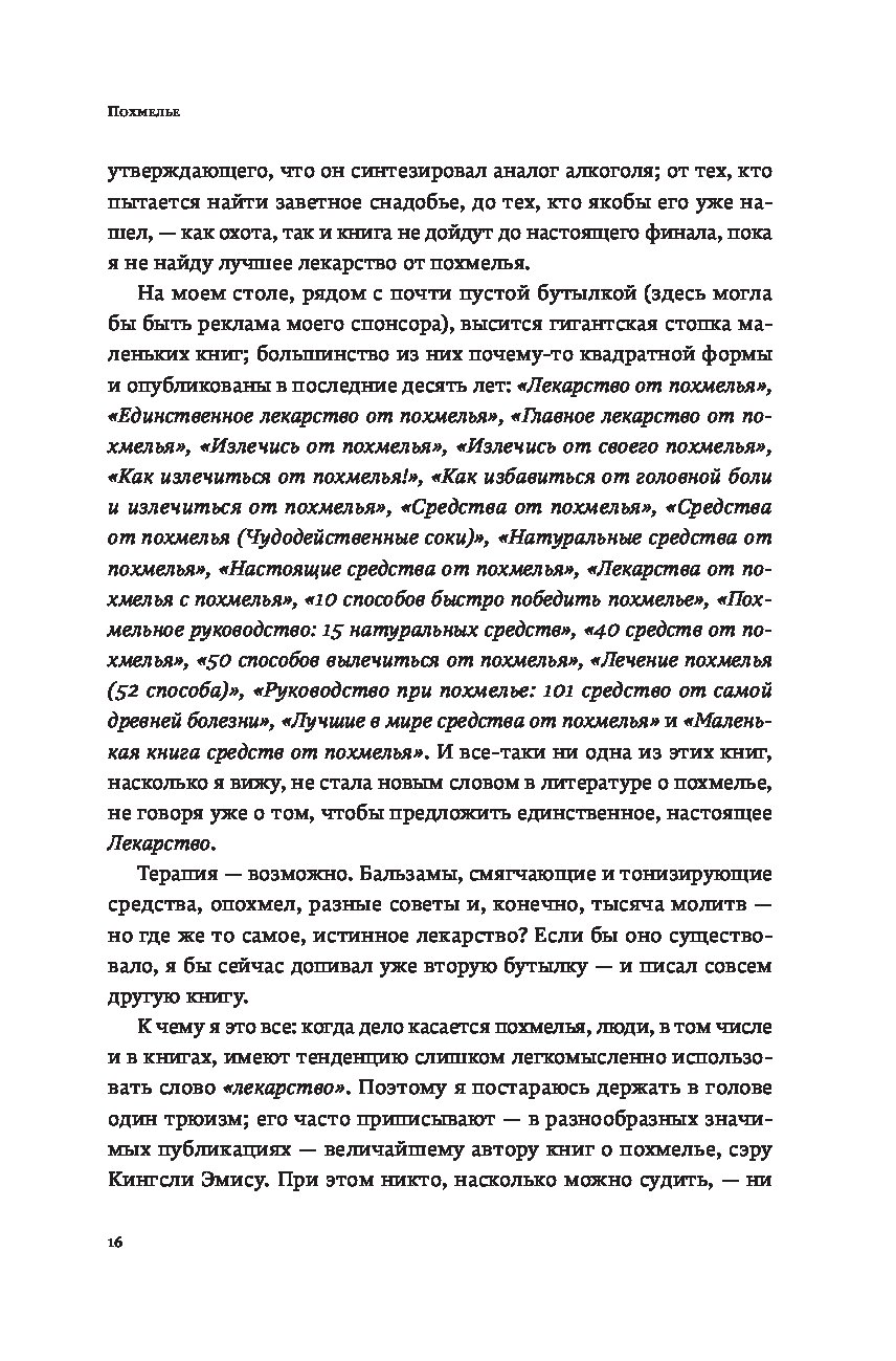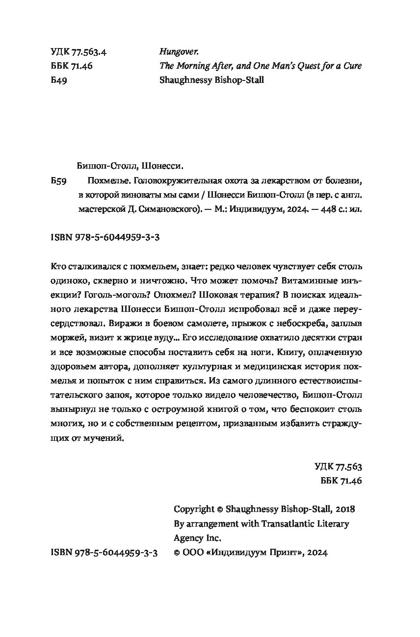 Кто сталкивался с похмельем, знает: редко человек чувствует себя столь одиноко, скверно и ничтожно. Что может помочь? Витаминные инъекции? Гоголь-моголь? Опохмел? Шоковая терапия? В поисках идеального лекарства Шонесси Бишоп-Столл испробовал всё и даже переусердствовал. Виражи в боевом самолете, прыжок с небоскреба, заплыв моржей, визит к жрице вуду… Его исследование охватило десятки стран и все возможные способы поставить себя на ноги. Книгу, оплаченную здоровьем автора, дополняет культурная и медицинская история похмелья и попыток с ним справиться. Из самого длинного естествоиспытательского запоя, которое только видело человечество, Бишоп-Столл вынырнул не только с остроумной книгой о том, что беспокоит столь многих, но и с собственным рецептом, призванным избавить страждущих от мучений.