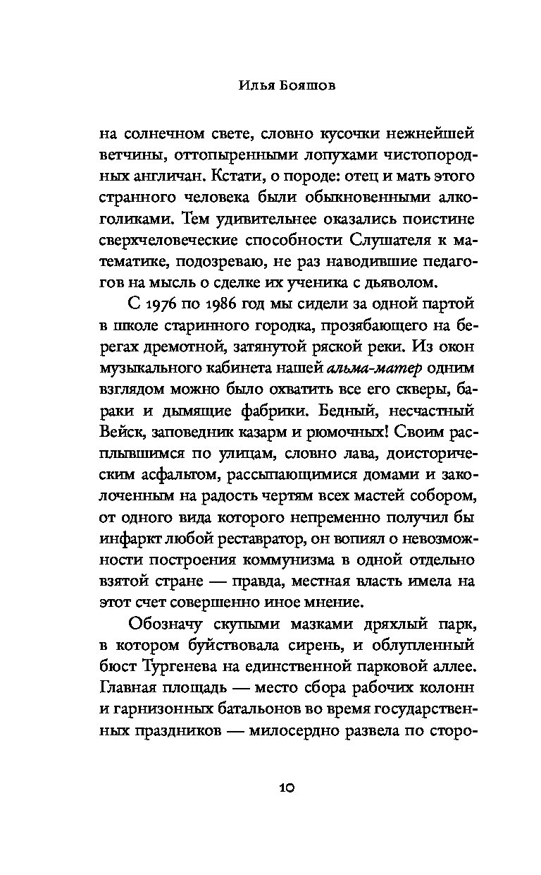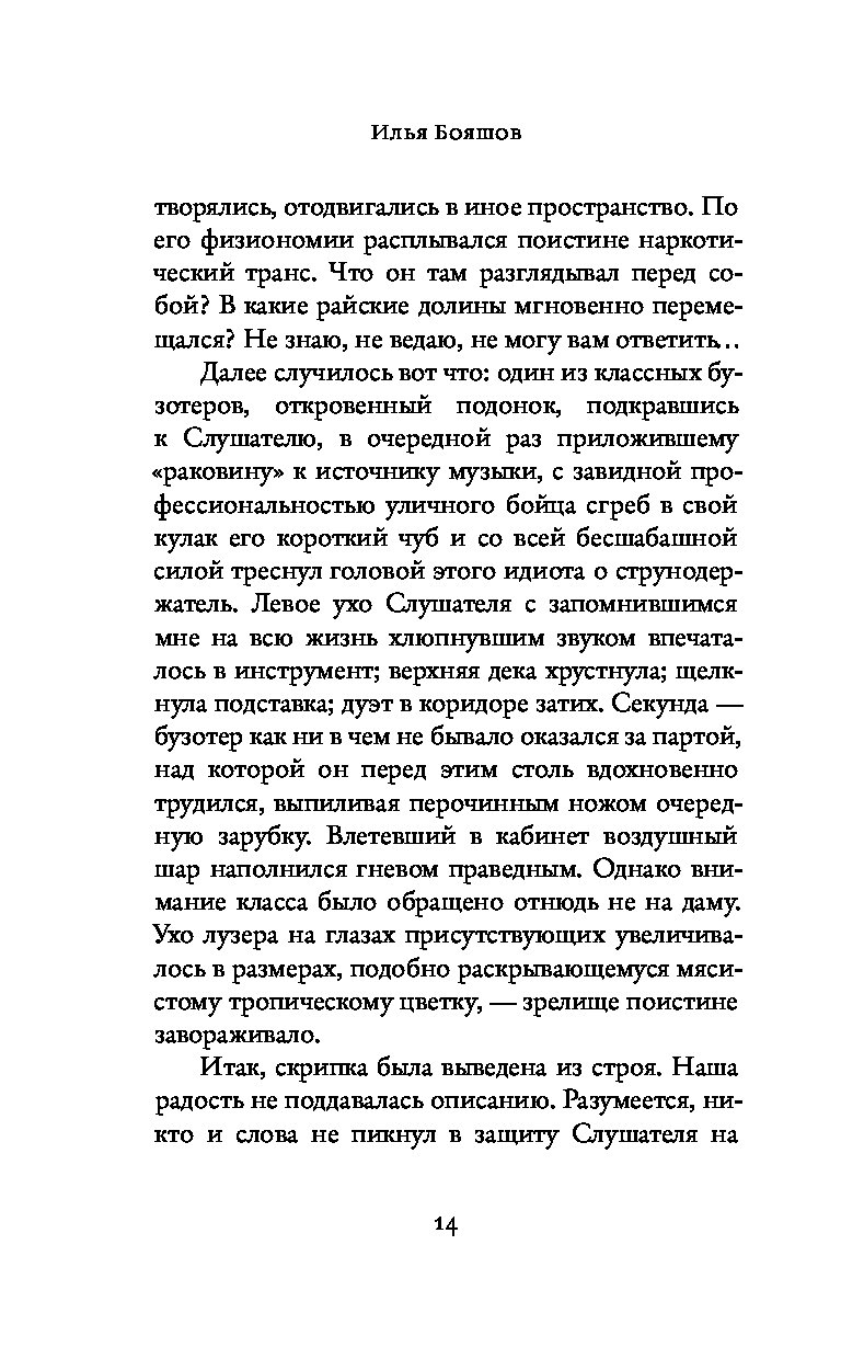 Илья Бояшов мне нравится тем, что он пишет совершенно не в русле современной российской литературы. Он пишет короткие, компактные и оригинальные вещи, постоян-но нащупывая новые формы.